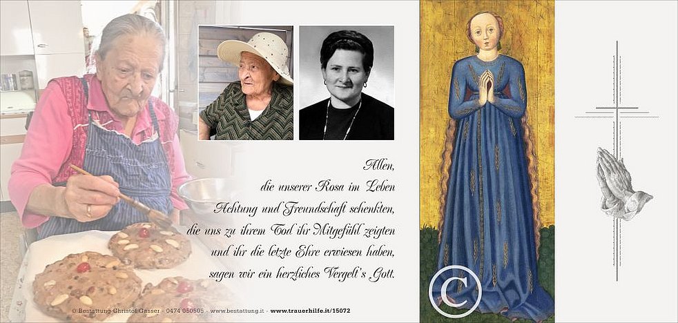 Ein besonderer Dank gilt dem Hausarzt Dr. Alex Mitterhofer, allen vom Hauspflegedienst, den Sprengelschwestern und dem gesamten Team von der Langzeitpflege vom Wohn- und Pflegeheim Bruneck.