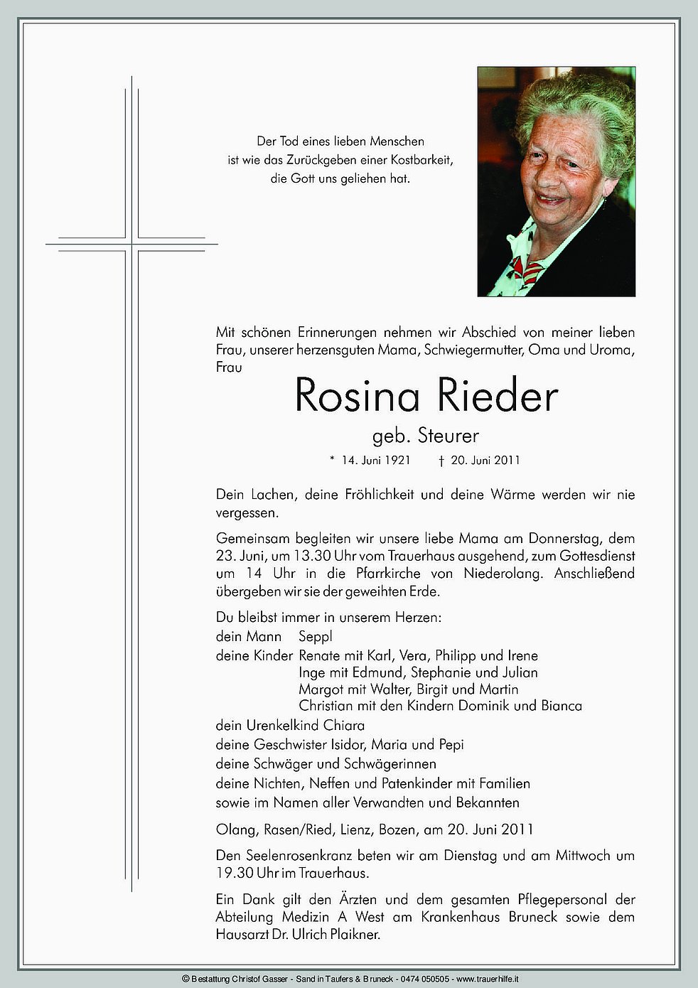 Gemeinsam begleiten wir unsere liebe Mama am Donnerstag, dem 23. Juni, um 13.30 Uhr vom Trauerhaus ausgehend, zum Gottesdienst um 14 Uhr in die Pfarrkirche von Niederolang. Anschließend übergeben wir sie der geweihten Erde.