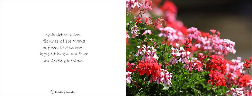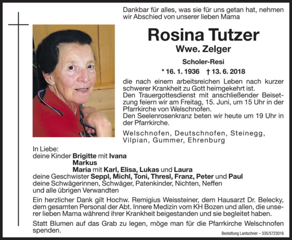 Ein herzlicher Dank gilt Hochw. Remigius Weissteiner, dem Hausarzt Dr. Belecky, dem gesamten Personal der Abt. Innere Medizin vom KH Bozen und allen, die unsere liebe Mama in ihrer Krankheit beigestanden und begleitet haben.