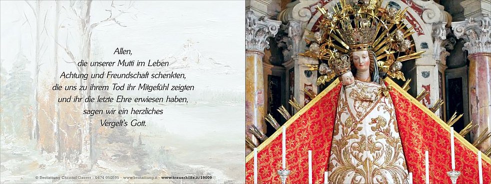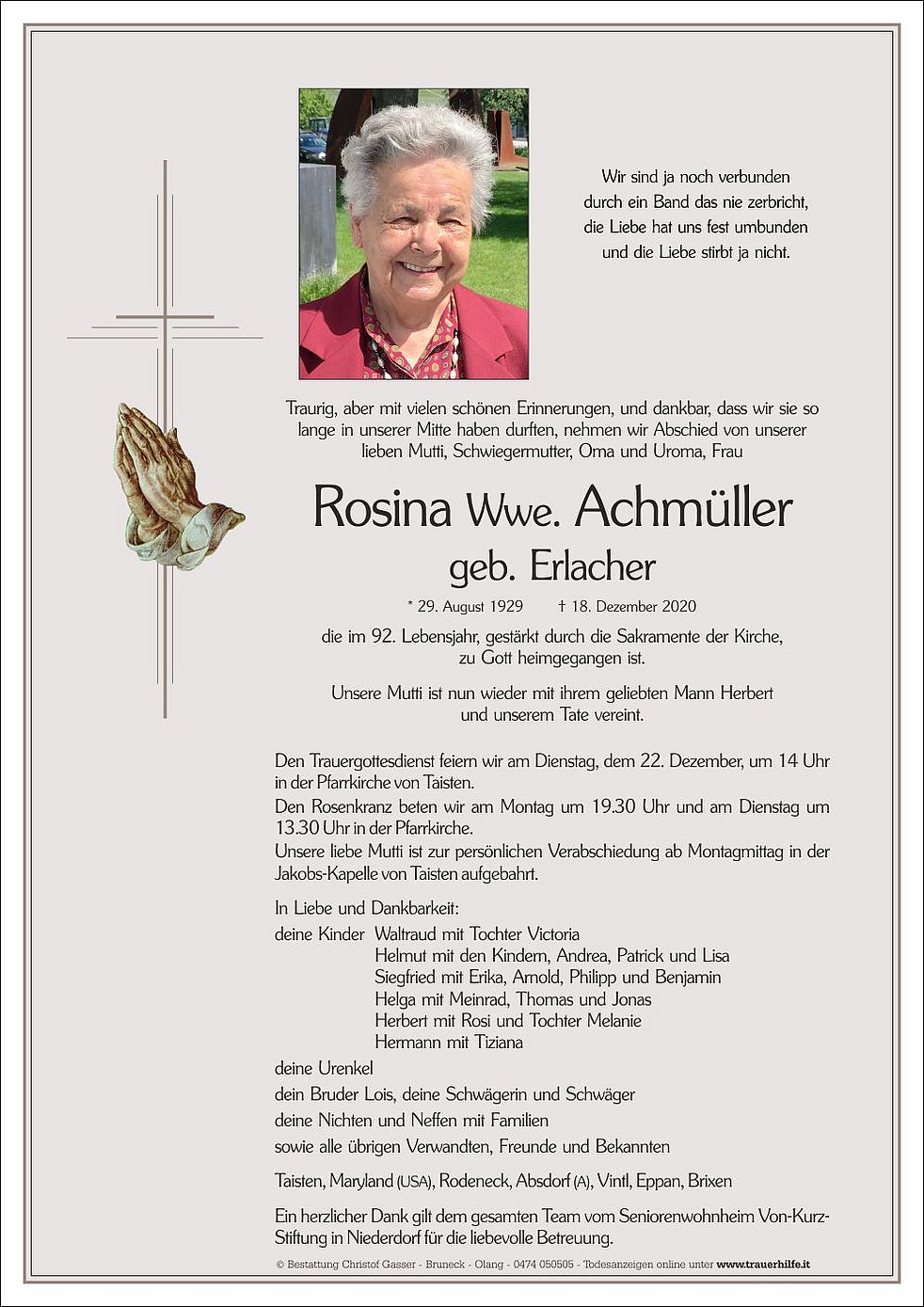 Den Trauergottesdienst feiern wir am Dienstag, dem 22. Dezember, um 14 Uhr in der Pfarrkirche von Taisten.