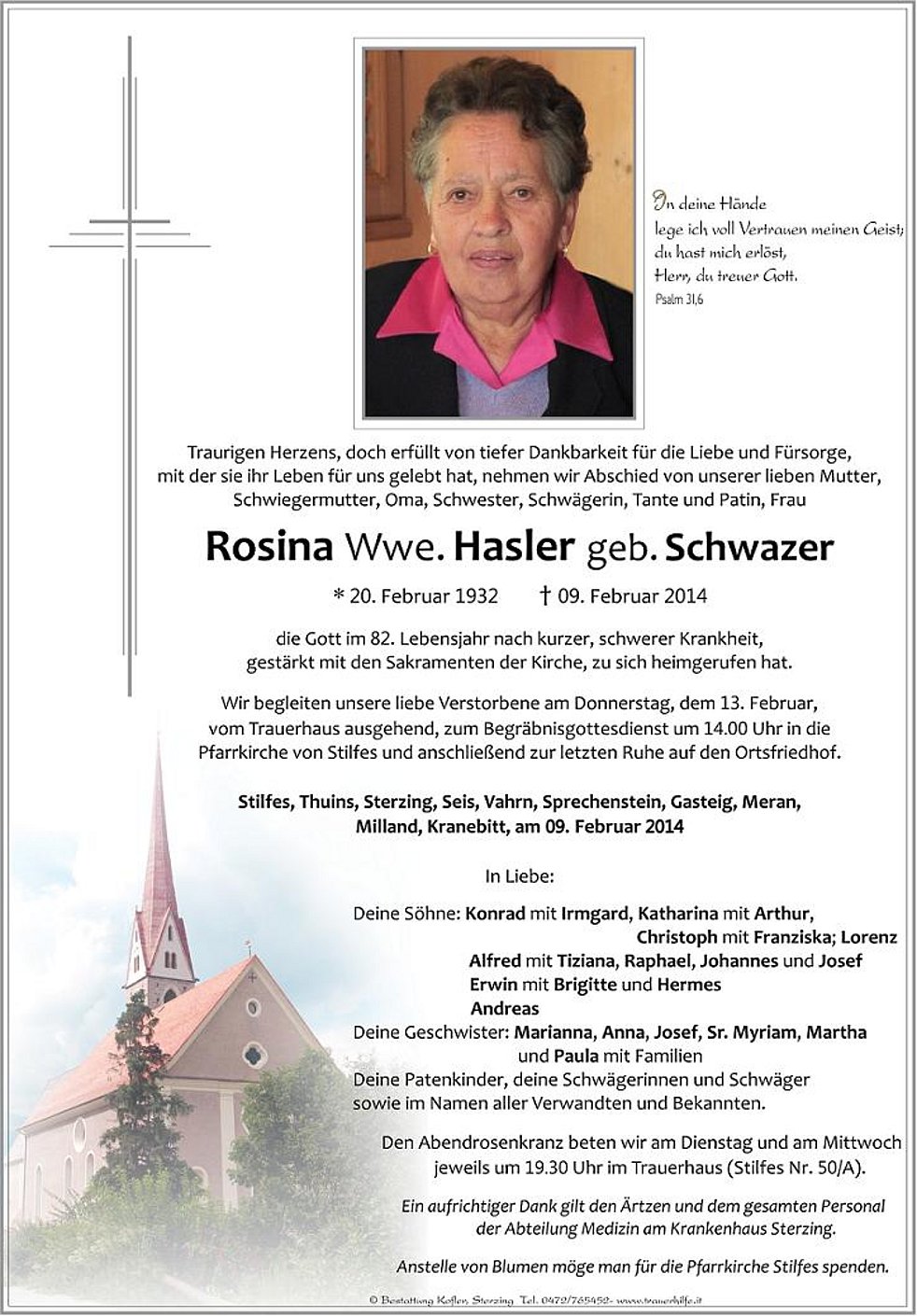 Anstelle von Blumen möge man für die Pfarrkirche Stilfes spenden.