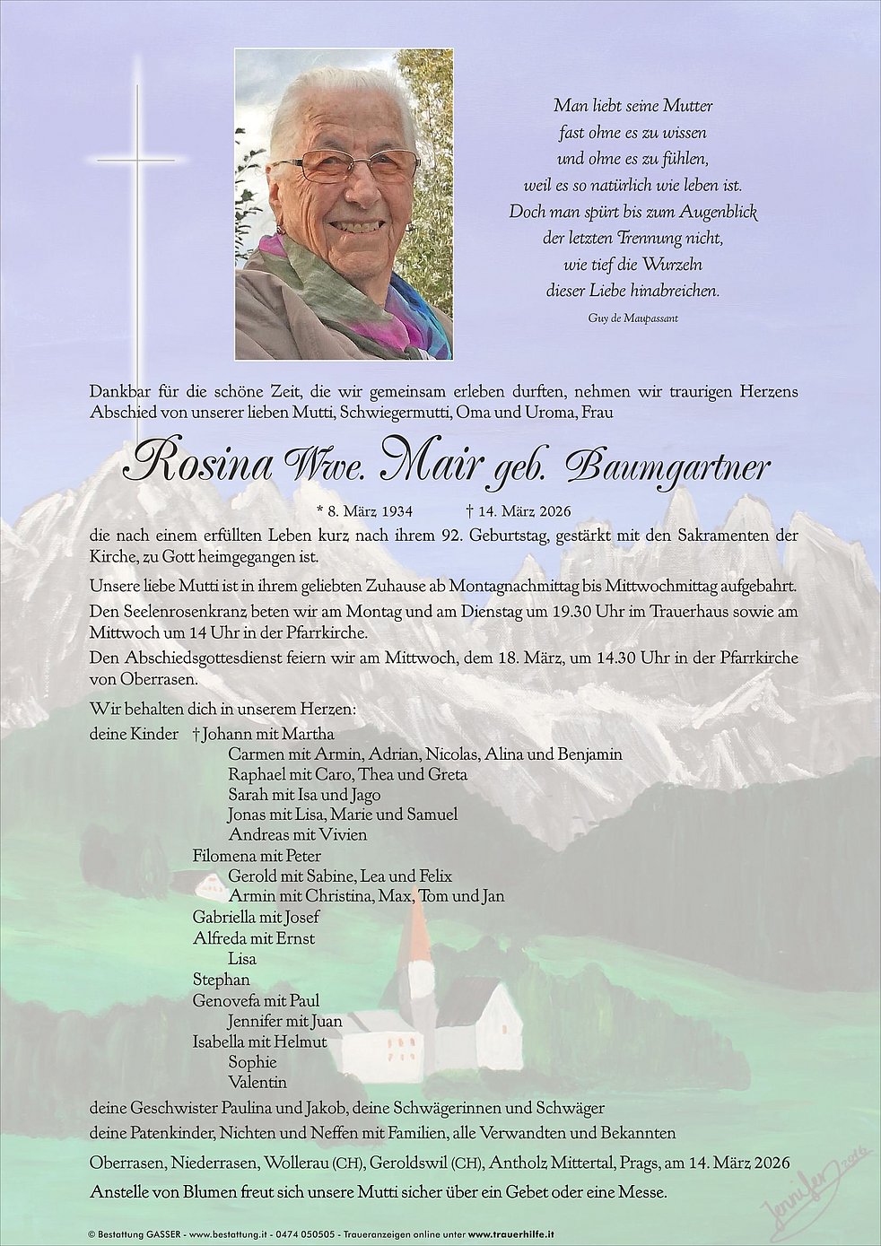 Den Abschiedsgottesdienst feiern wir am Mittwoch, dem 18. März, um 14.30 Uhr in der Pfarrkirche von Oberrasen.