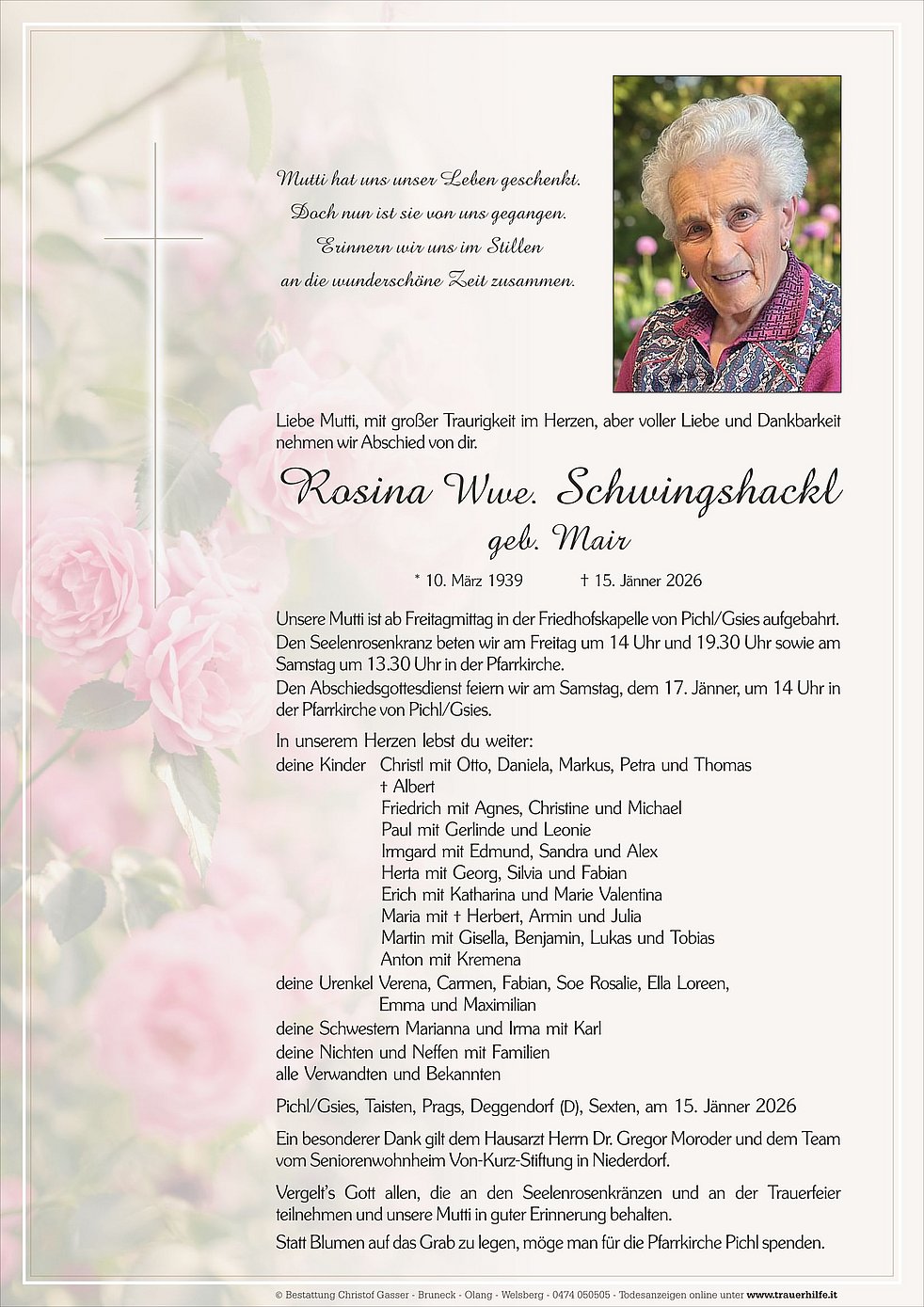 Vergelt’s Gott allen, die an den Seelenrosenkränzen und an der Trauerfeier teilnehmen und unsere Mutti in guter Erinnerung behalten.