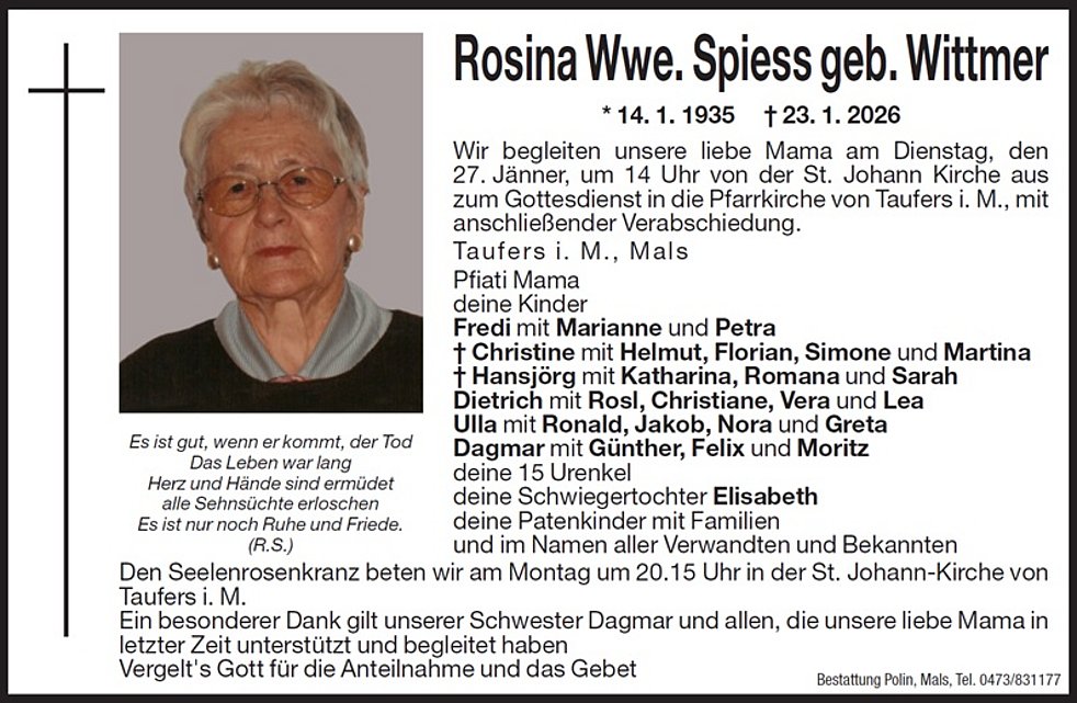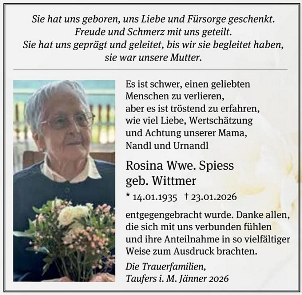 Wir begleiten unsere liebe Mama am Dienstag, den 27. Jänner um 14 Uhr