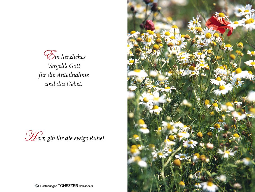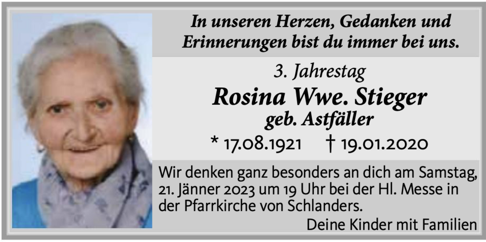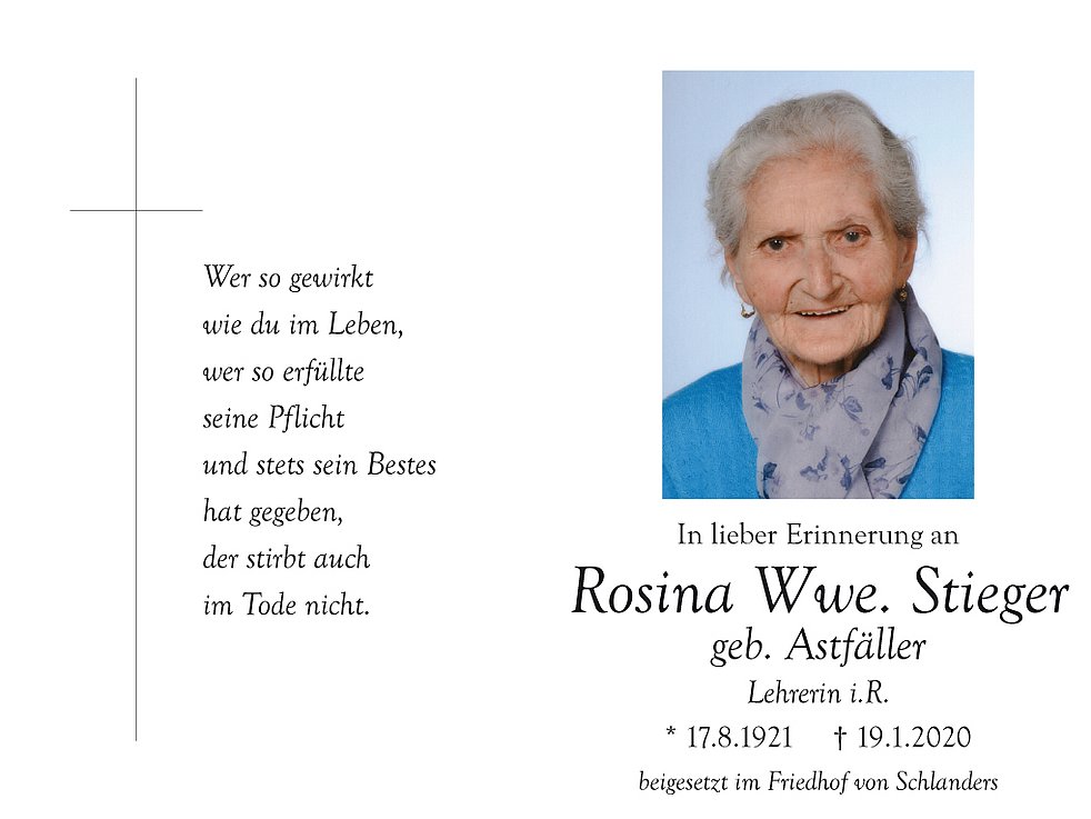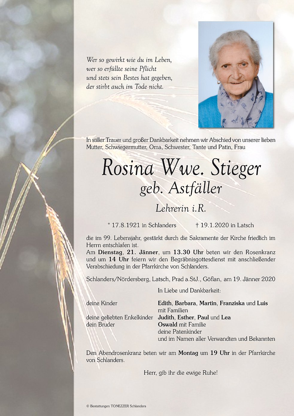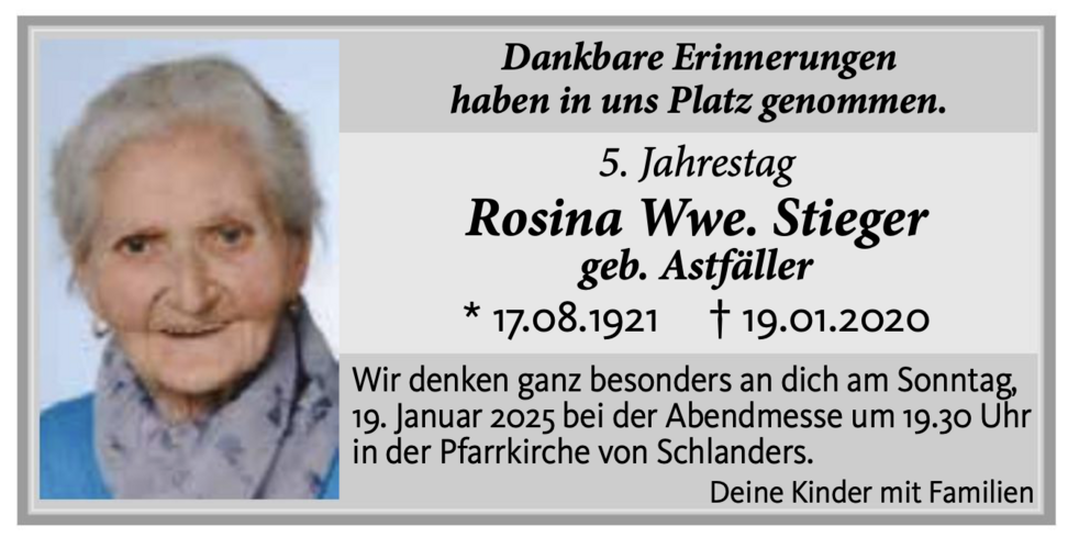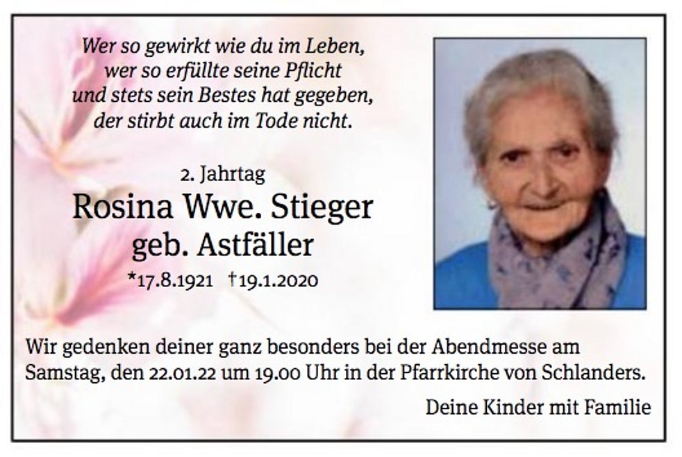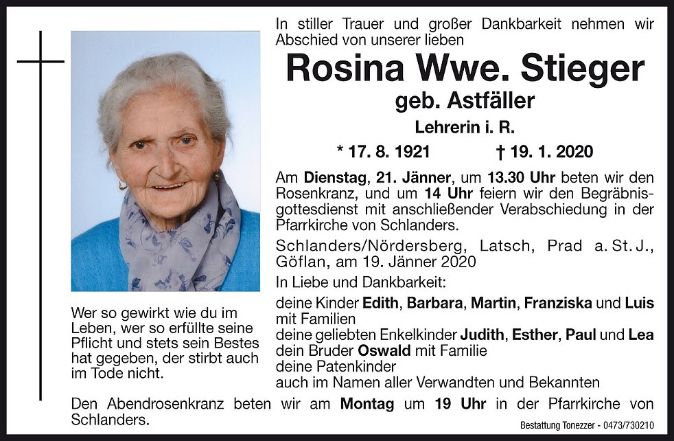 Am Dienstag, 21. Jänner, um 13.30 Uhr beten wir den Rosenkranz und um 14 Uhr feiern wir den Begräbnisgottesdienst mit anschließender Verabschiedung in der Pfarrkirche von Schlanders.
