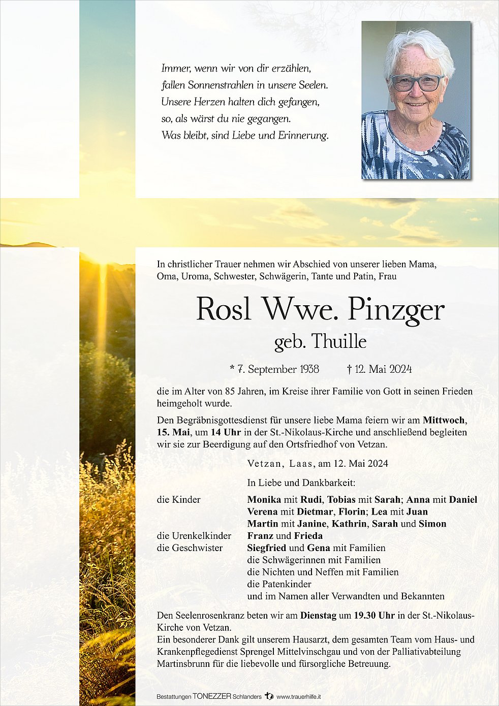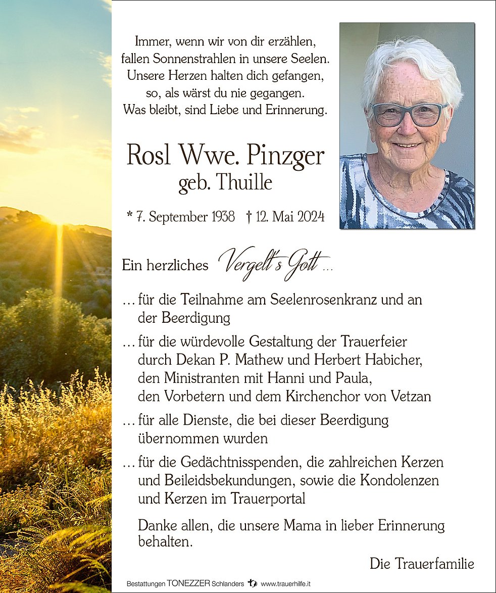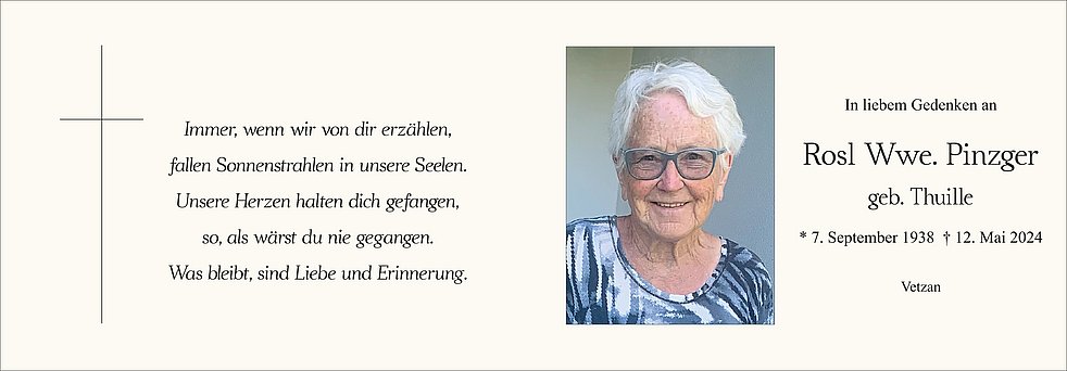 Ich werde Eure Mama Rosl immer in lieber Erinnerung behalten und bin dankbar für all das , was sie für unsere Familie getan hat.