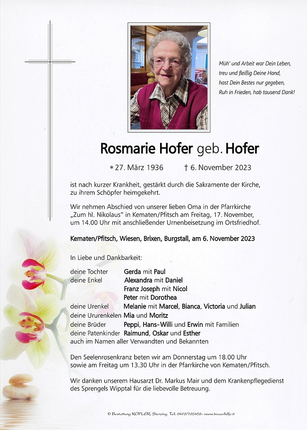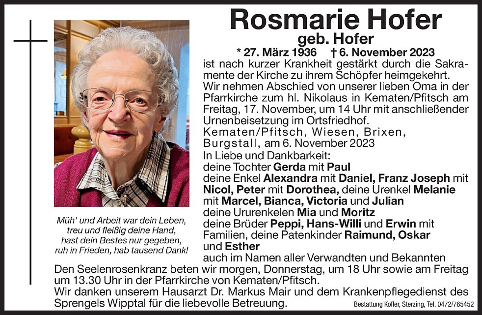 Wir nehmen Abschied von unserer lieben Oma in der Pfarrkirche „Zum hl. Nikolaus” in Kematen/Pfitsch am Freitag, 17. November, um 14.00 Uhr mit anschließender Urnenbeisetzung im Ortsfriedhof.