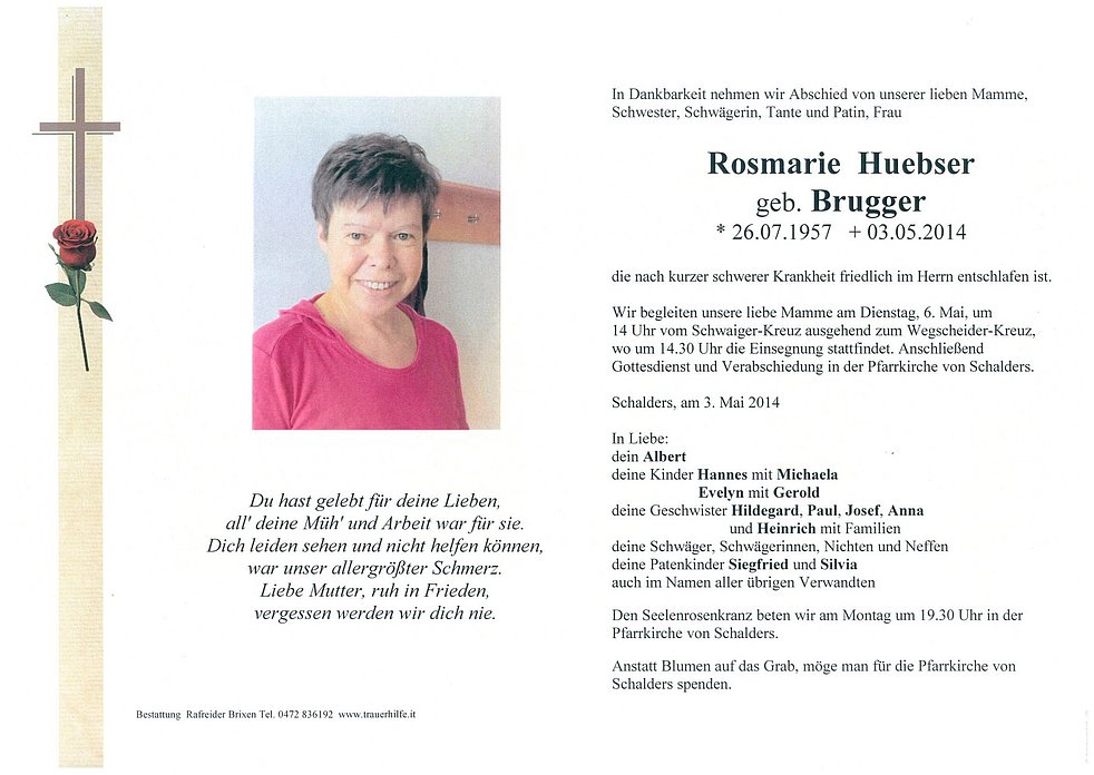 Gedankt sei den Ärzten und dem Pflegepersonal der Abteilung Medizin 1 des Brixner Krankenhauses für die liebevolle Betreuung und allen die am Rosenkranz und an der Verabschiedung teilnehmen.