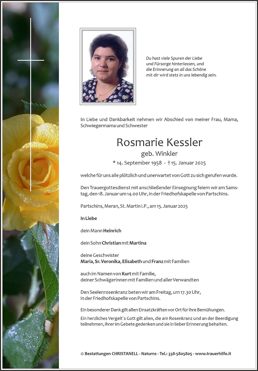 Den Trauergottesdienst mit anschließender Einsegnung feiern wir am Samstag, den 18. Januar um 14.00 Uhr, in der Friedhofskapelle von Partschins.