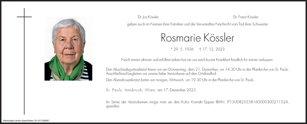 Im Sinne der Verstorbenen möge man an den Kultur Kontakt Eppan IBAN: IT15U0825558160000300211524, spenden.