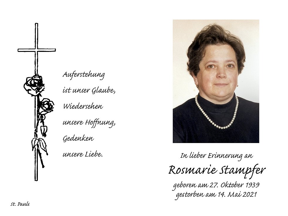Den Trauergottesdienst feiern wir am Montag dem 17. Mai um 14.30 Uhr in der Pfarrkirche von St. Pauls. Anschließend begleiten wir unsere liebe Verstorbene auf den Ortsfriedhof.