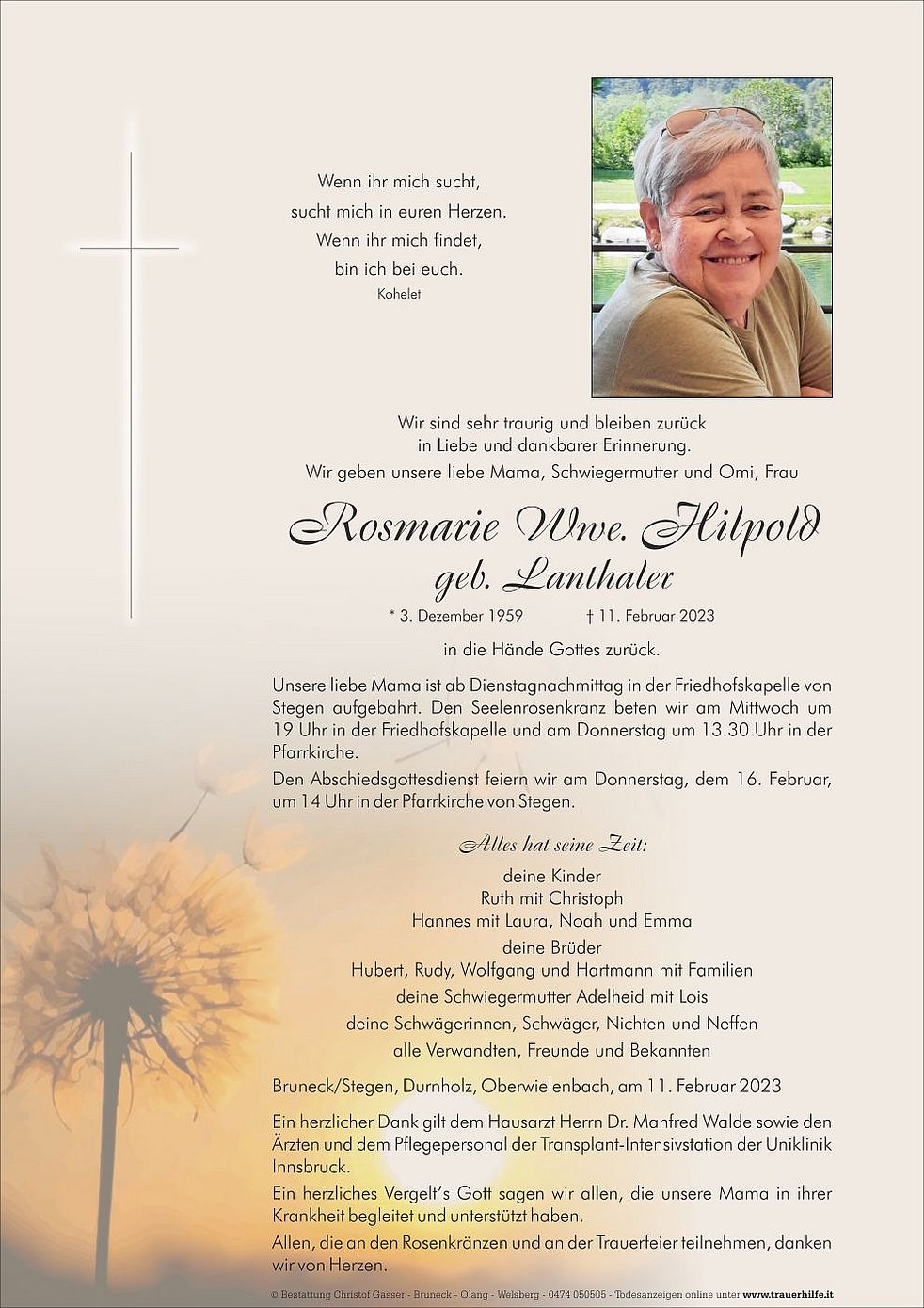 Unsere liebe Mama ist ab Dienstagnachmittag in der Friedhofskapelle von Stegen aufgebahrt. Den Seelenrosenkranz beten wir am Mittwoch um 19 Uhr in der Friedhofskapelle und am Donnerstag um 13.30 Uhr in der Pfarrkirche.