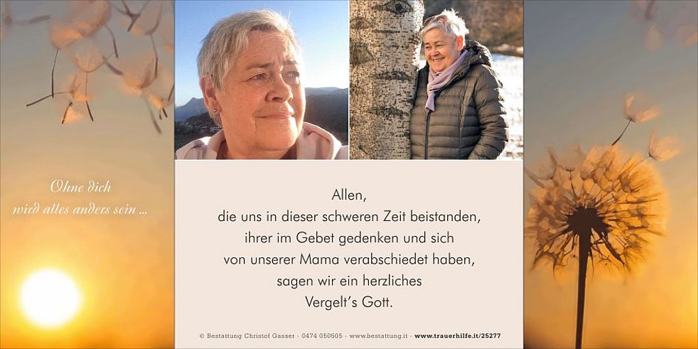 Ein herzliches Vergelt’s Gott sagen wir allen, die unsere Mama in ihrer Krankheit begleitet und unterstützt haben.