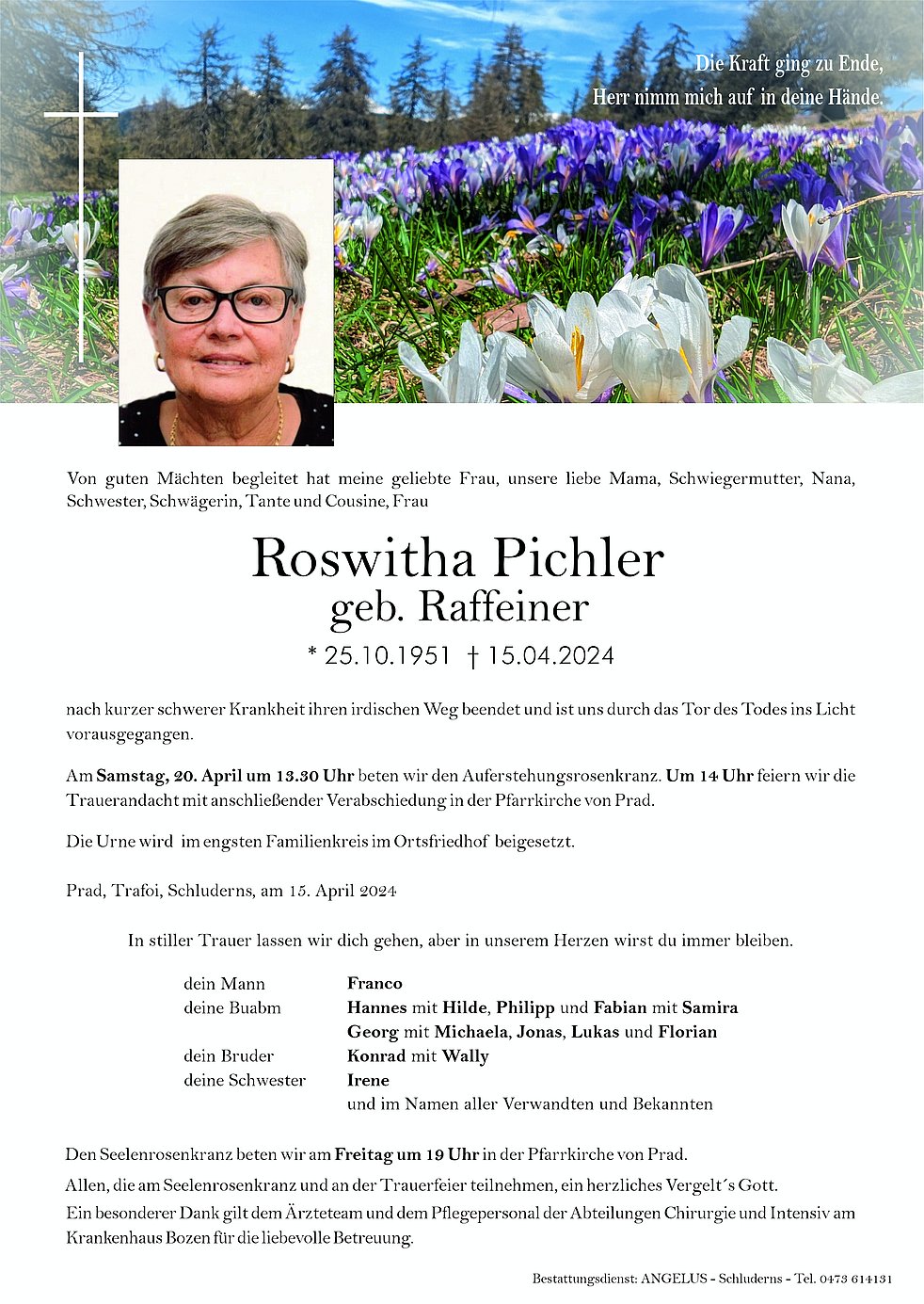 Lieber Franco, es tut mir unendlich leid, dass deine Roswitha so früh und so schnell diese Welt verlassen mußte. Ich wünsche dir und deiner Familie viel Kraft und Menschen, die euch auffangen und begleiten in eurem Schmerz.