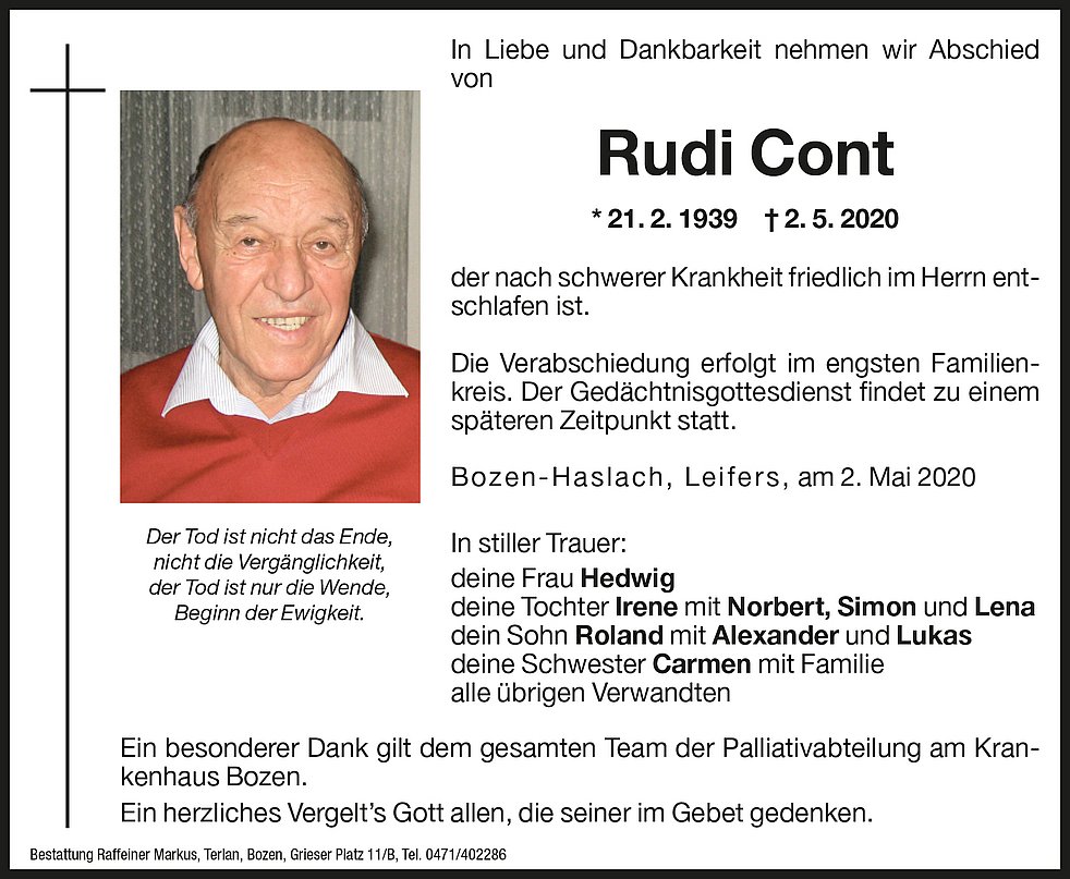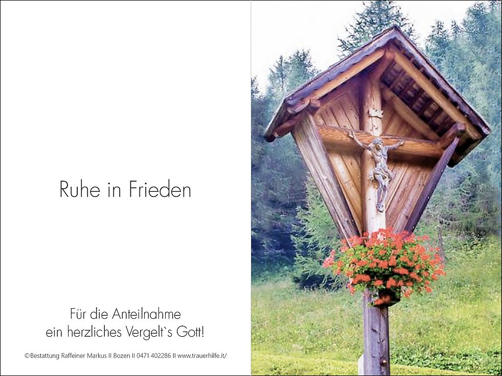 Ein besonderer Dank gilt dem gesamten Team der Palliativabteilung im Krankenhaus Bozen. Ein herzliches Vergelt’s Gott allen, die seiner im Gebet gedenken.