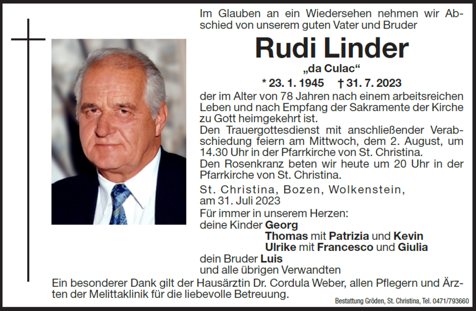 Den Trauergottesdienst mit anschließender Verabschiedung feiern am Mittwoch, dem 02. August, um 14.30 Uhr in der Pfarrkirche von St. Christina.