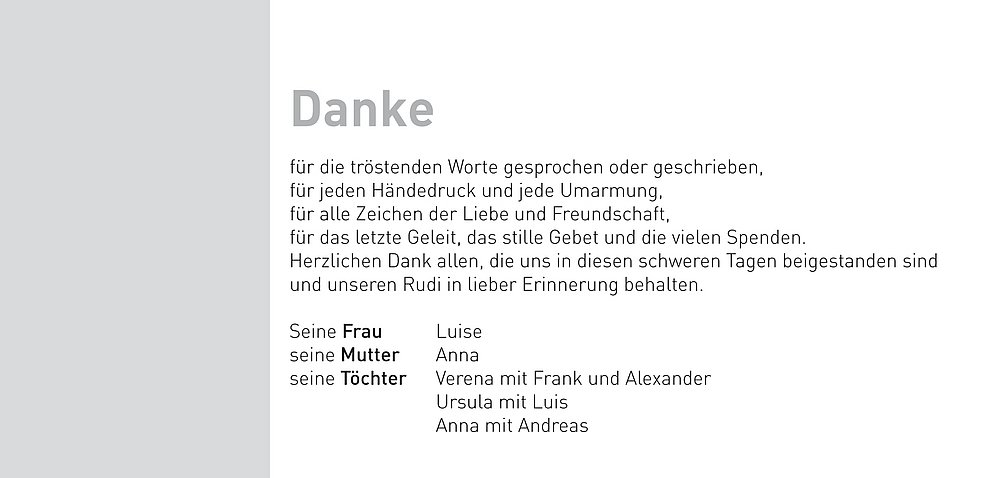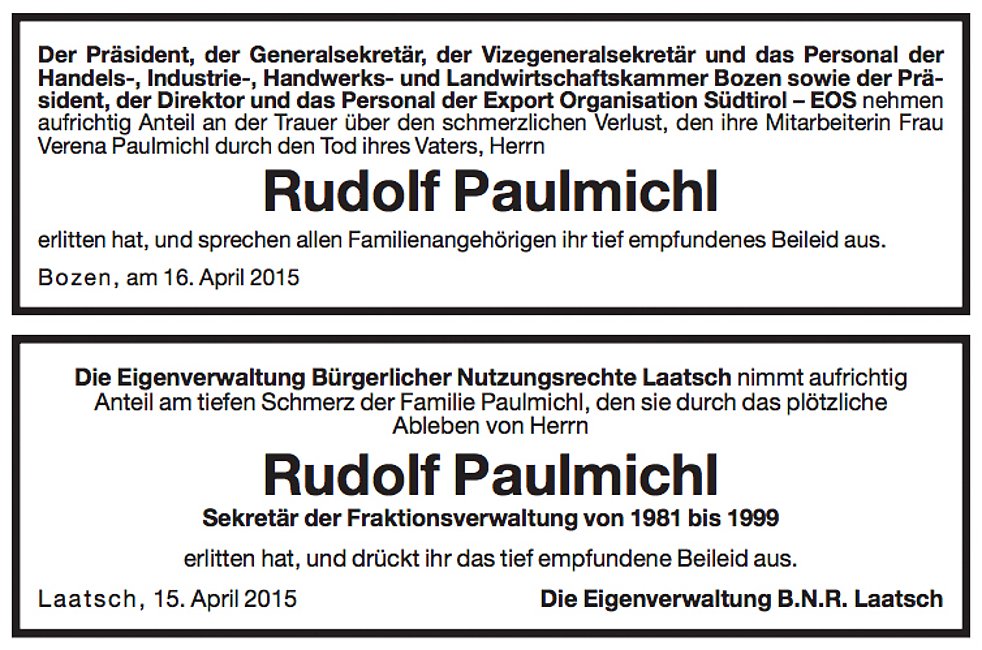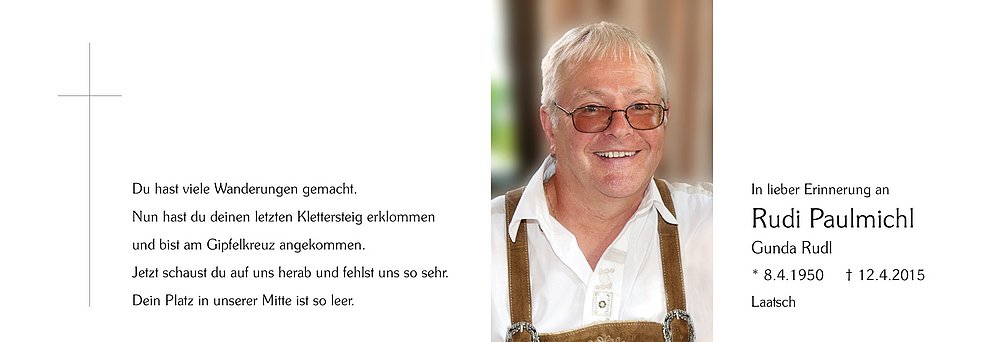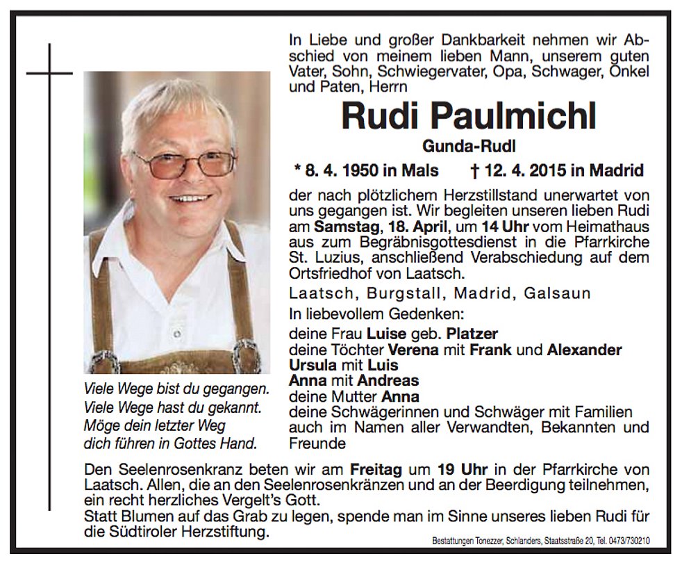 Statt Blumen auf das Grab zu legen, spende man im Sinne unseres lieben Rudi für die Südtiroler Herzstiftung.