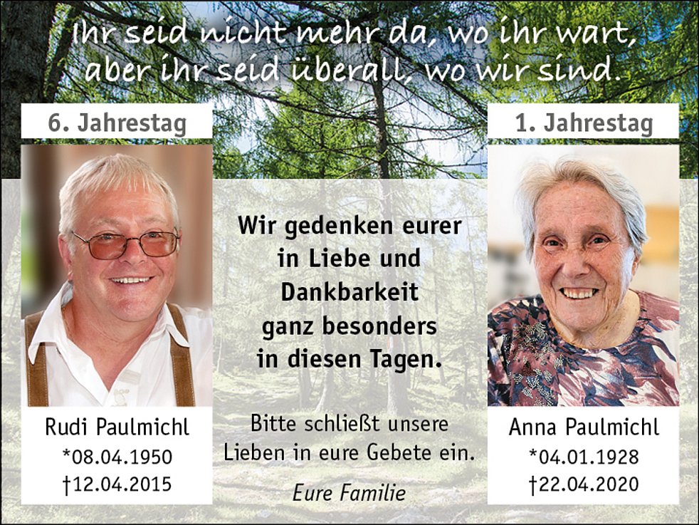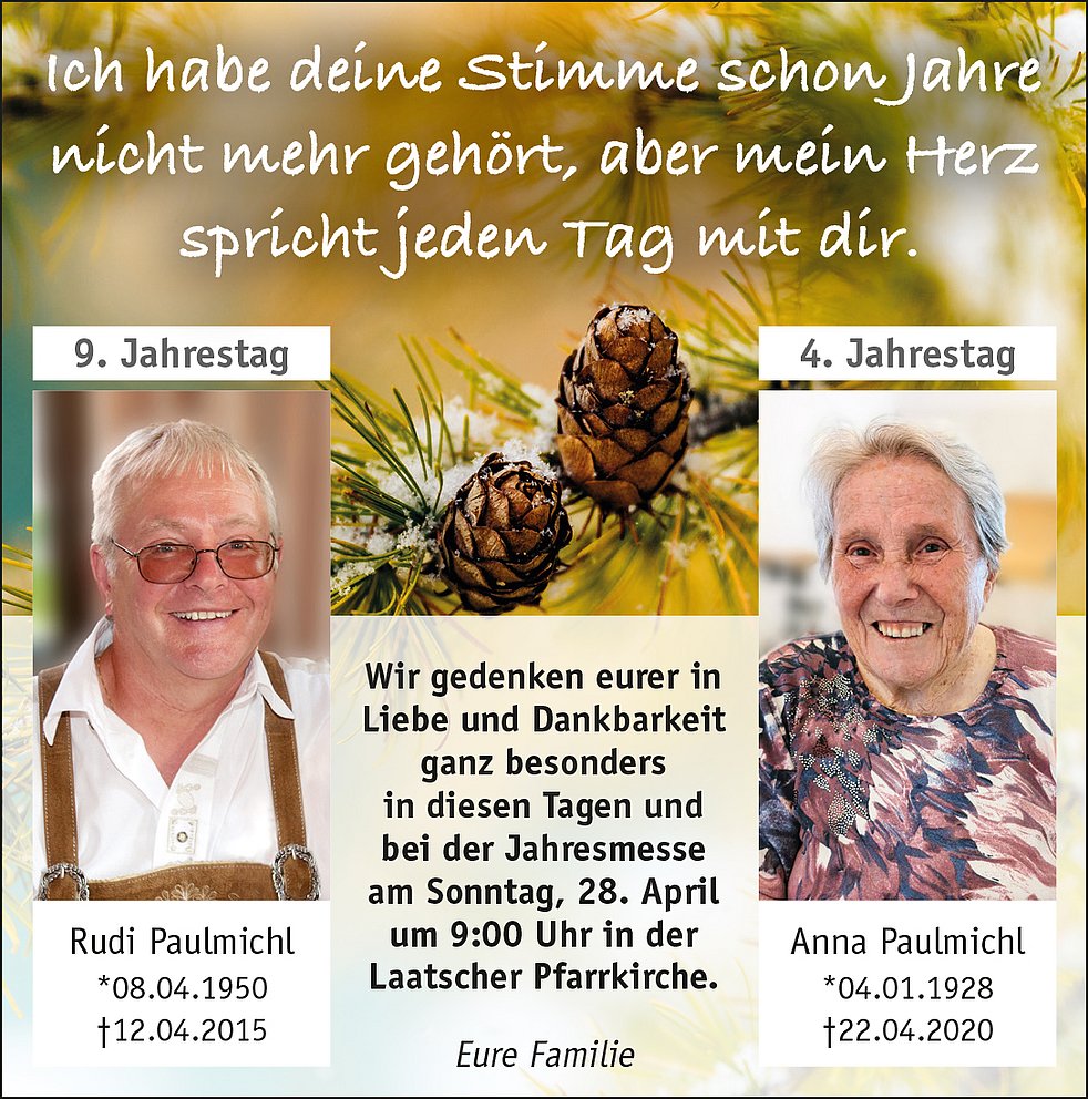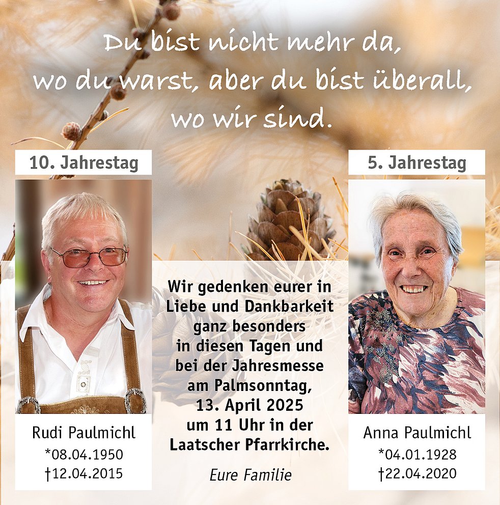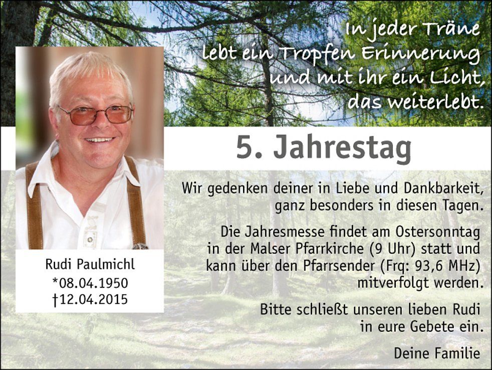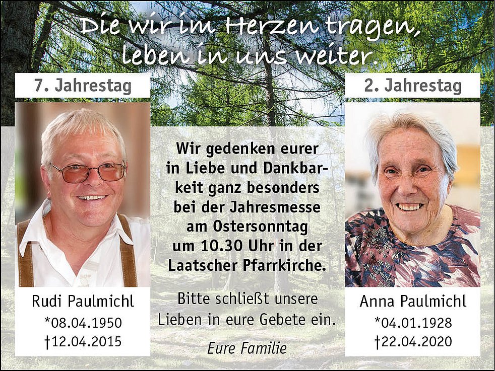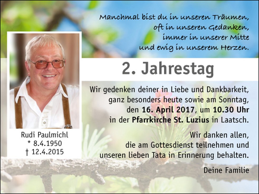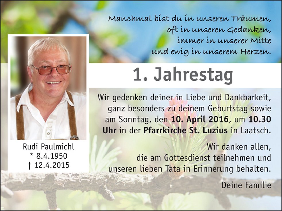 Wir begleiten unseren lieben Rudi am Samstag, 18. April, um 14 Uhr vom Heimathaus aus zum Begräbnisgottesdienst in die Pfarrkirche St. Luzius, anschließend Verabschiedung auf dem Ortsfriedhof von Laatsch.