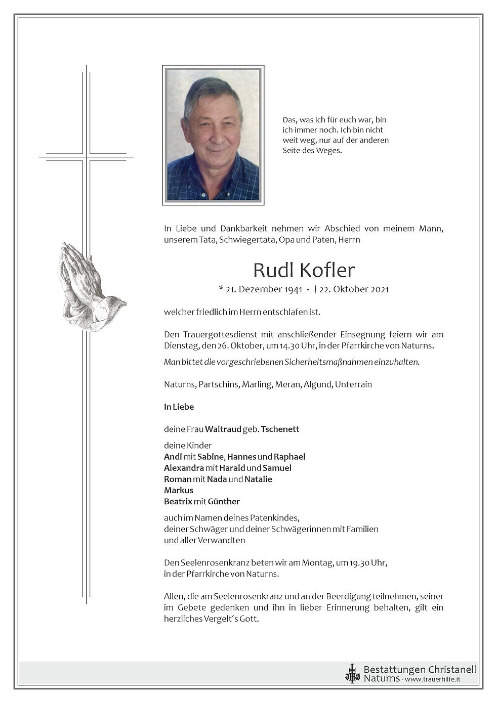 Den Trauergottesdienst mit anschließender Einsegnung feiern wir am Dienstag, den 26. Oktober, um 14.30 Uhr, in der Pfarrkirche von Naturns.