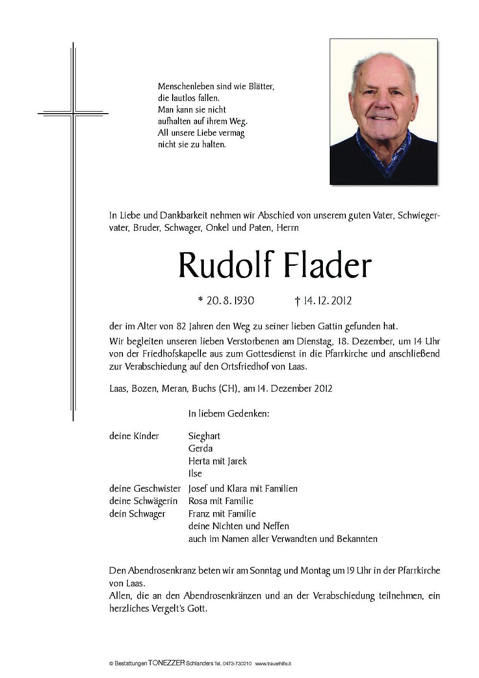 Wir begleiten unseren lieben Verstorbenen am Dienstag, 18. Dezember, um 14 Uhr von der Friedhofskapelle aus zum Gottesdienst in die Pfarrkirche und anschließend zur Verabschiedung auf den Ortsfriedhof von Laas.