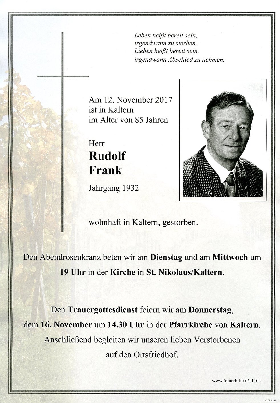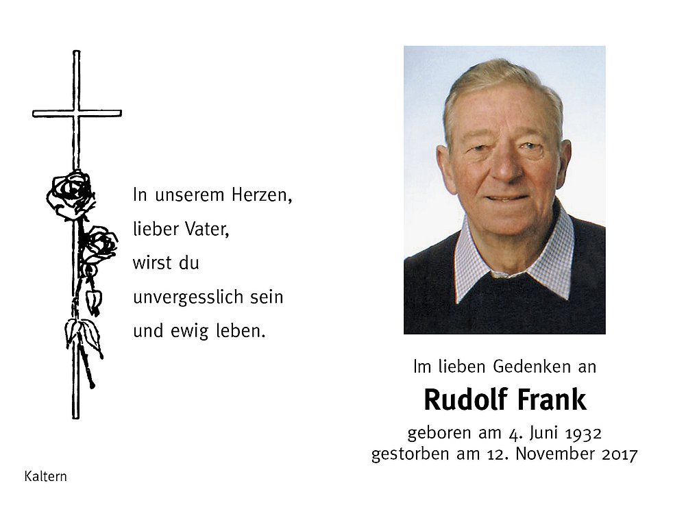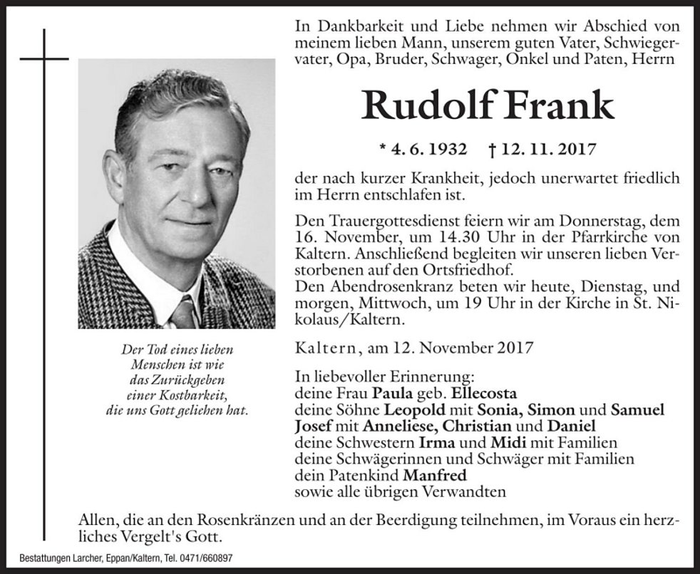 Den Trauergottesdienst feiern wir am Donnerstag, dem 16. November um 14.30 Uhr in der Pfarrkirche von Kaltern. Anschließend begleiten wir unseren lieben Verstorbenen auf den Ortsfriedhof.