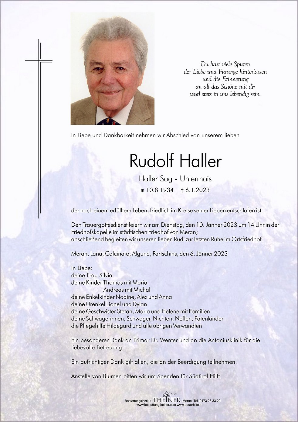 Den Trauergottesdienst feiern wir am Dienstag, den 10. Jänner 2023 um 14 Uhr in der Friedhofskapelle im städtischen Friedhof von Meran;
