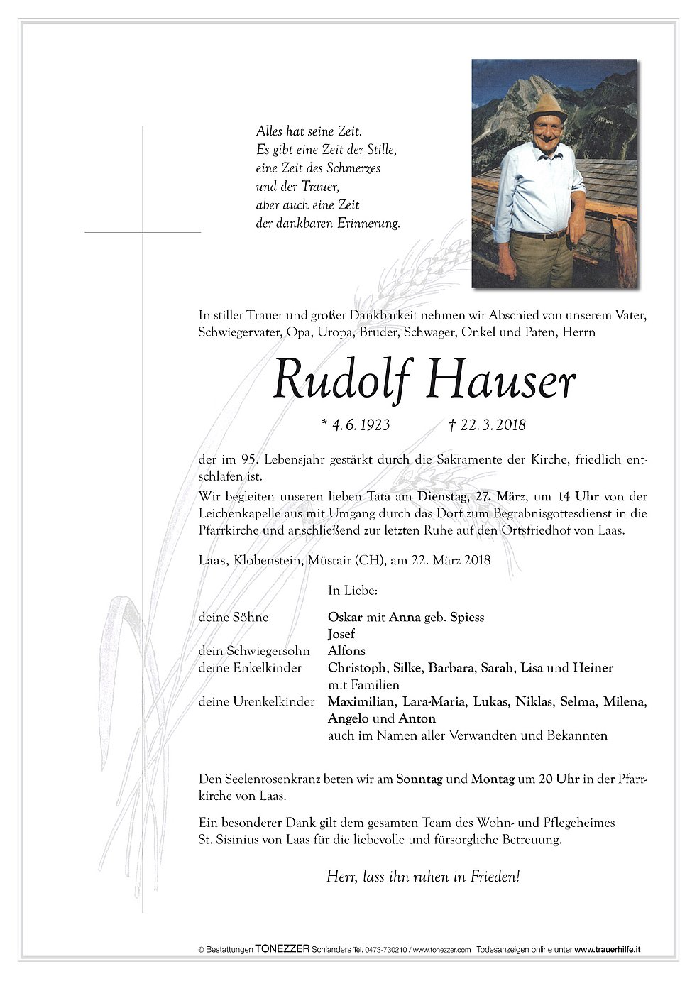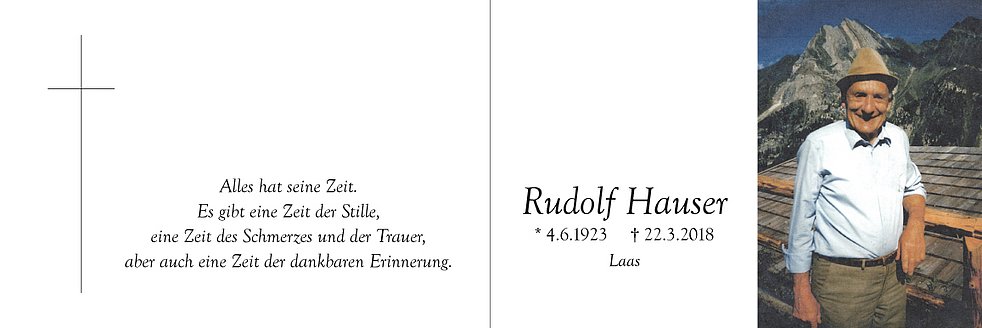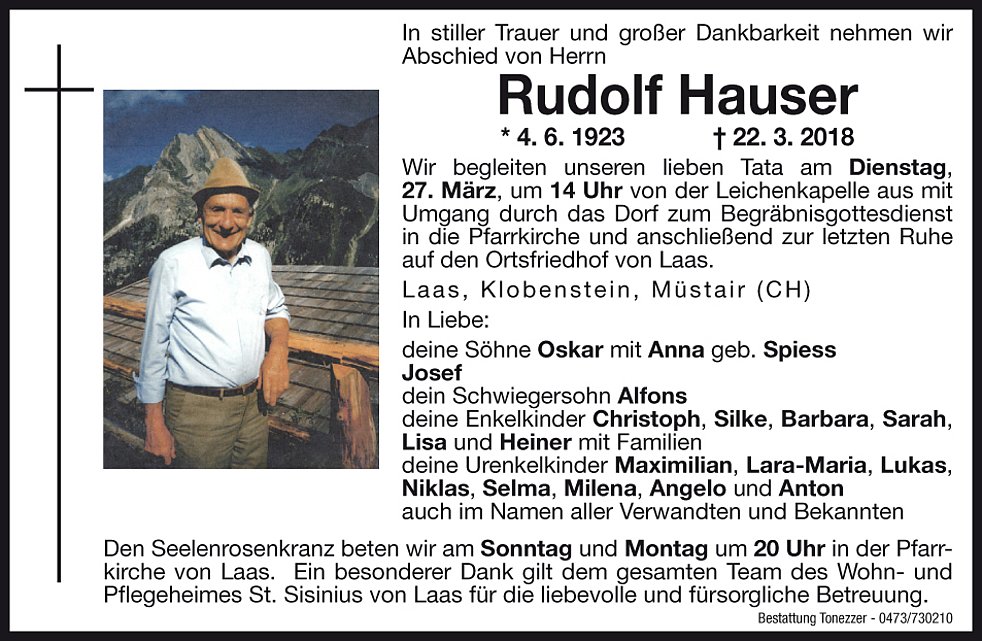 Wir begleiten unseren lieben Tata am Dienstag, 27. März, um 14 Uhr von der Leichenkapelle aus mit Umgang durch das Dorf zum Begräbnisgottesdienst in die Pfarrkirche und anschließend zur letzten Ruhe auf den Ortsfriedhof von Laas.