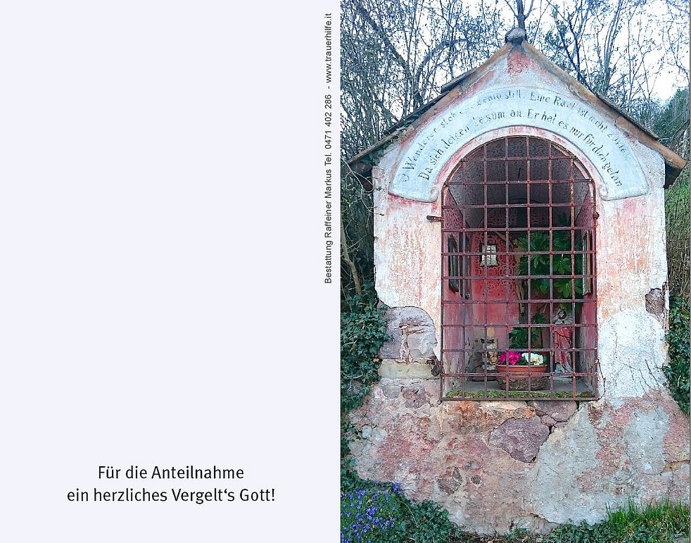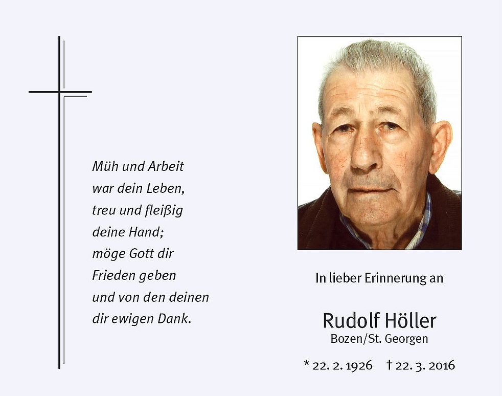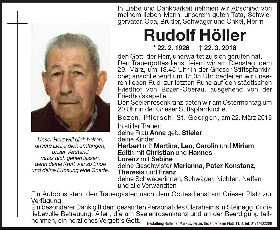 Den Trauergottesdienst feiern wir am Dienstag, dem 29. März, um 13.45 Uhr in der Grieser Stiftspfarrkirche; anschlieβend um 15.05 Uhr begleiten wir unseren lieben Rudi zur letzten Ruhe auf den städtischen Friedhof von Bozen-Oberau, ausgehend von der Friedhofskapelle.