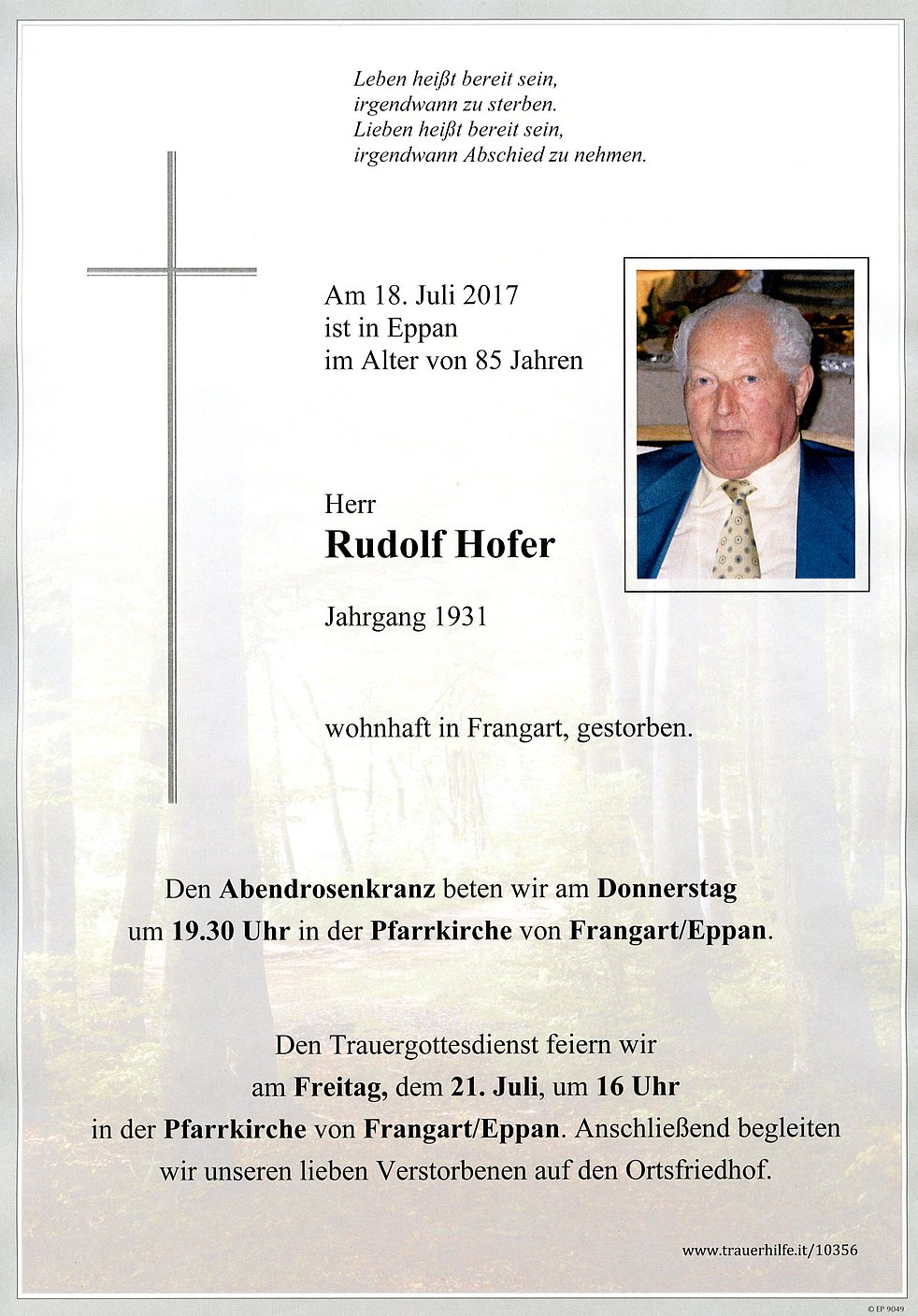 Den Abschiedsgottesdienst feiern wir am Freitag, den 21. Juli um 16 Uhr in der Pfarrkirche von Frangart. Anschließend begleiten wir unseren lieben Verstorbenen auf den Ortsfriedhof.