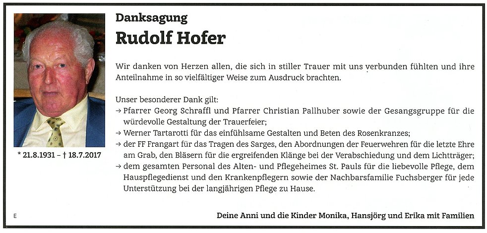 Unser Dank gilt dem Pflegepersonal des Altenheimes St. Pauls für die liebevolle Betreuung und Begleitung.