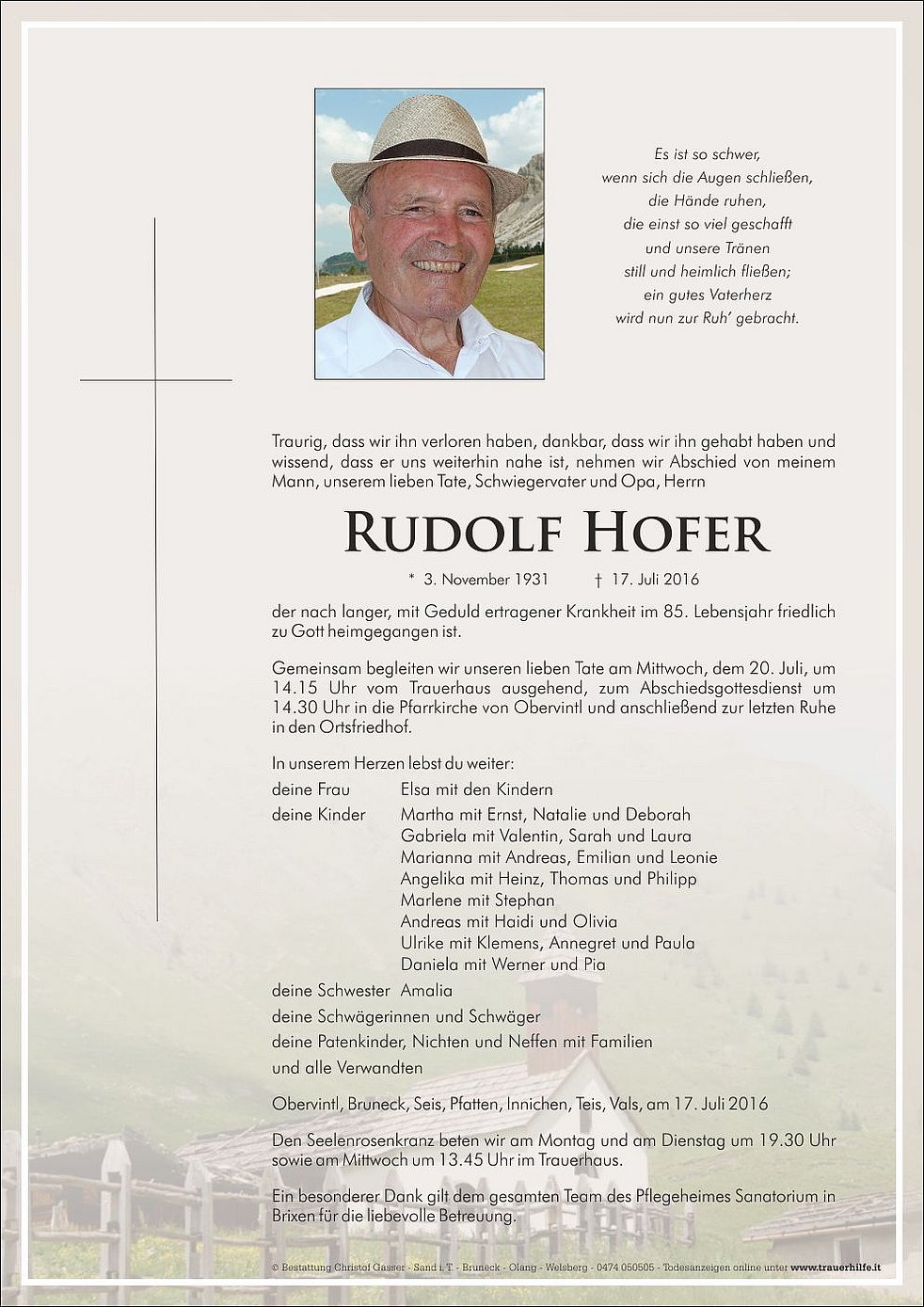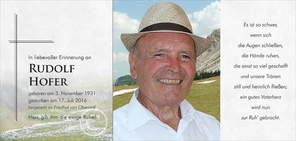14.30 Uhr in die Pfarrkirche von Obervintl und anschließend zur letzten Ruhe in den Ortsfriedhof.