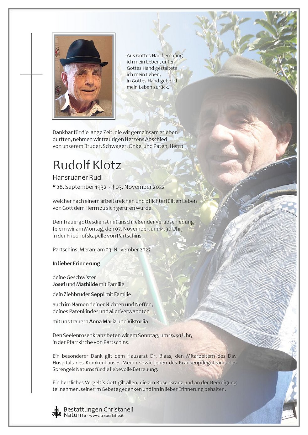 Den Trauergottesdienst mit anschließender Verabschiedung feiern wir am Montag, den 07. November, um 14.30 Uhr, in der Friedhofskapelle von Partschins.