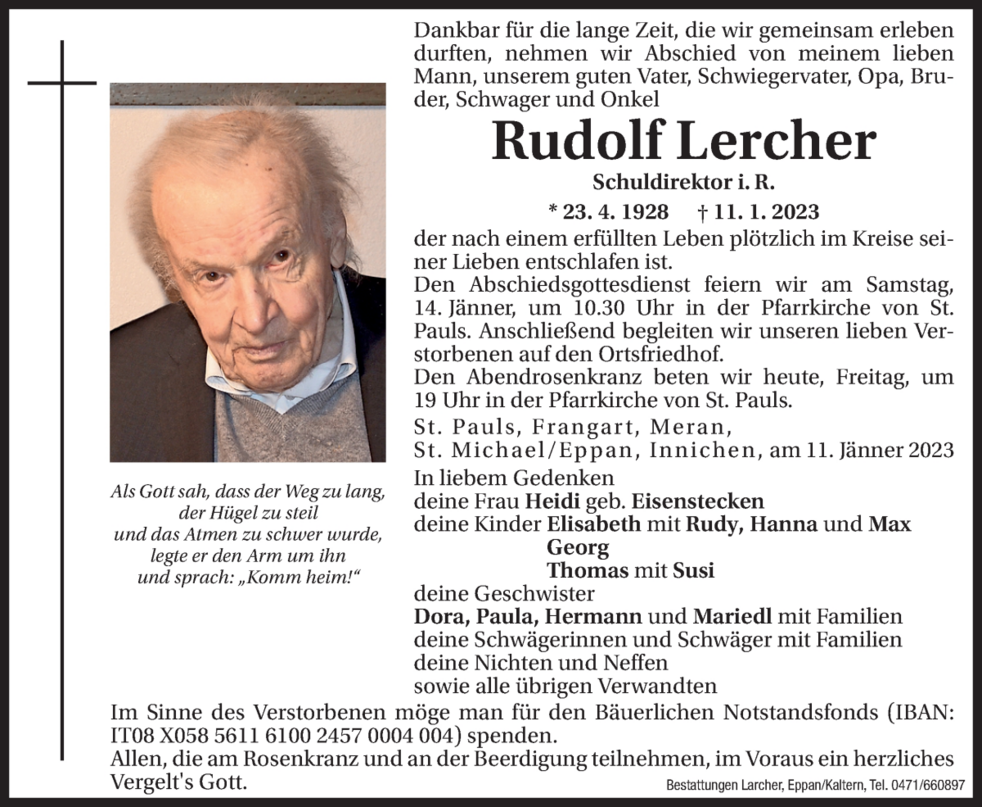 Im Sinne des Verstorbenen möge man für den Bäuerlichen Notstandsfonds (IBAN: IT08X0585611610024570004004) spenden.