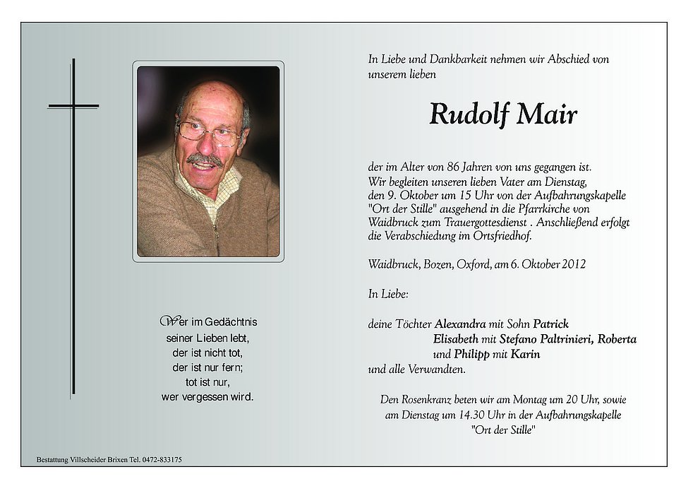 "Ort der Stille" ausgehend in die Pfarrkirche von Waidbruck zum Trauergottesdienst . Anschließend erfolgt die Verabschiedung im Ortsfriedhof.