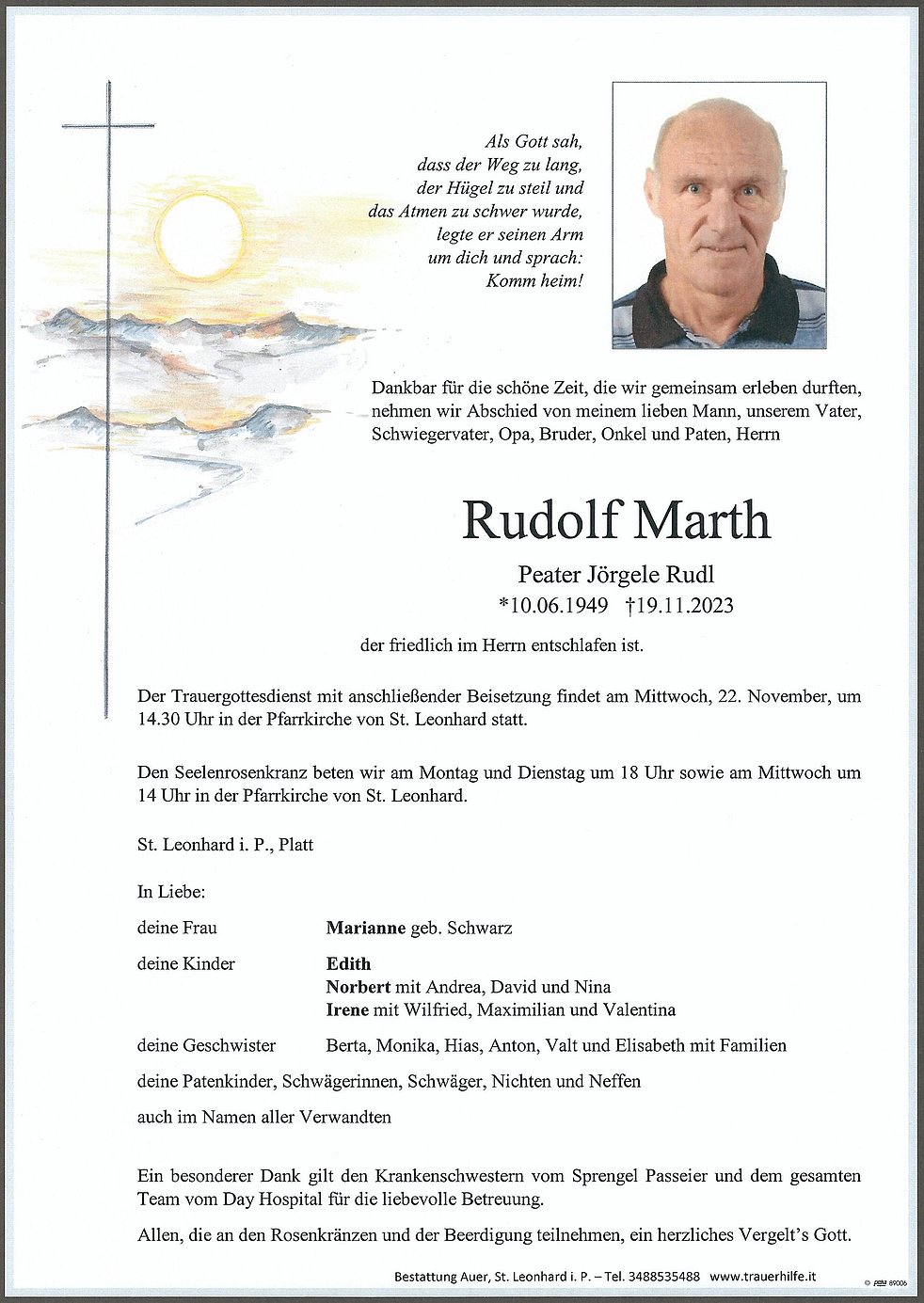 Der Trauergottesdienst mit anschließender Beisetzung findet am Mittwoch, 22. November, um 14.30 Uhr in der Pfarrkirche von St. Leonhard statt.