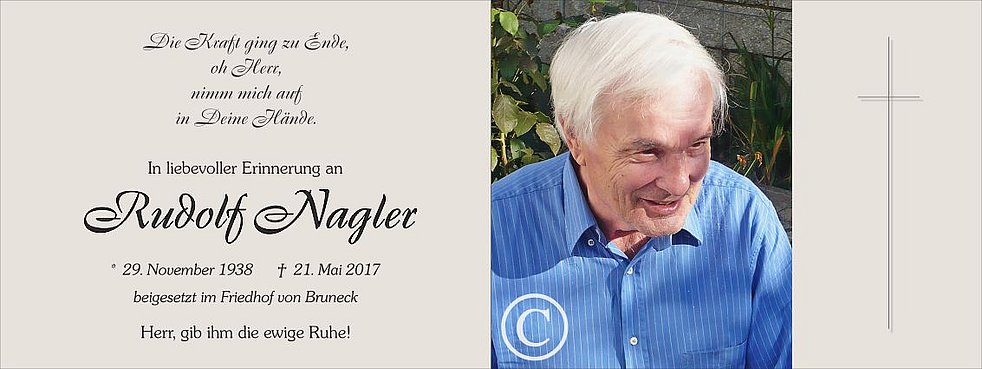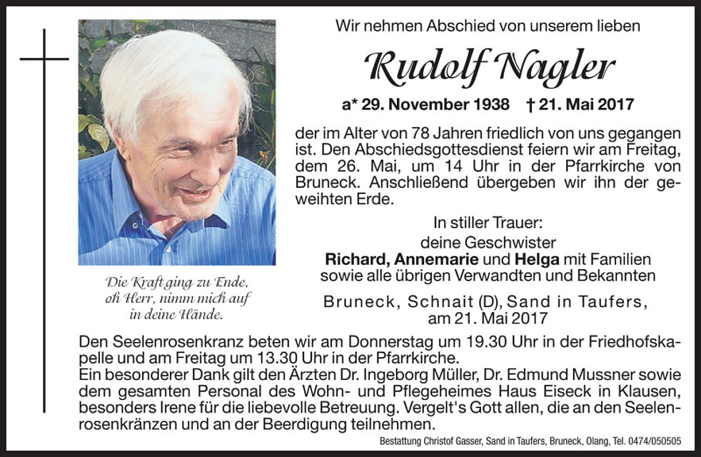 Den Abschiedsgottesdienst feiern wir am Freitag, dem 26. Mai, um 14 Uhr in der Pfarrkirche von Bruneck. Anschließend übergeben wir ihn der geweihten Erde.
