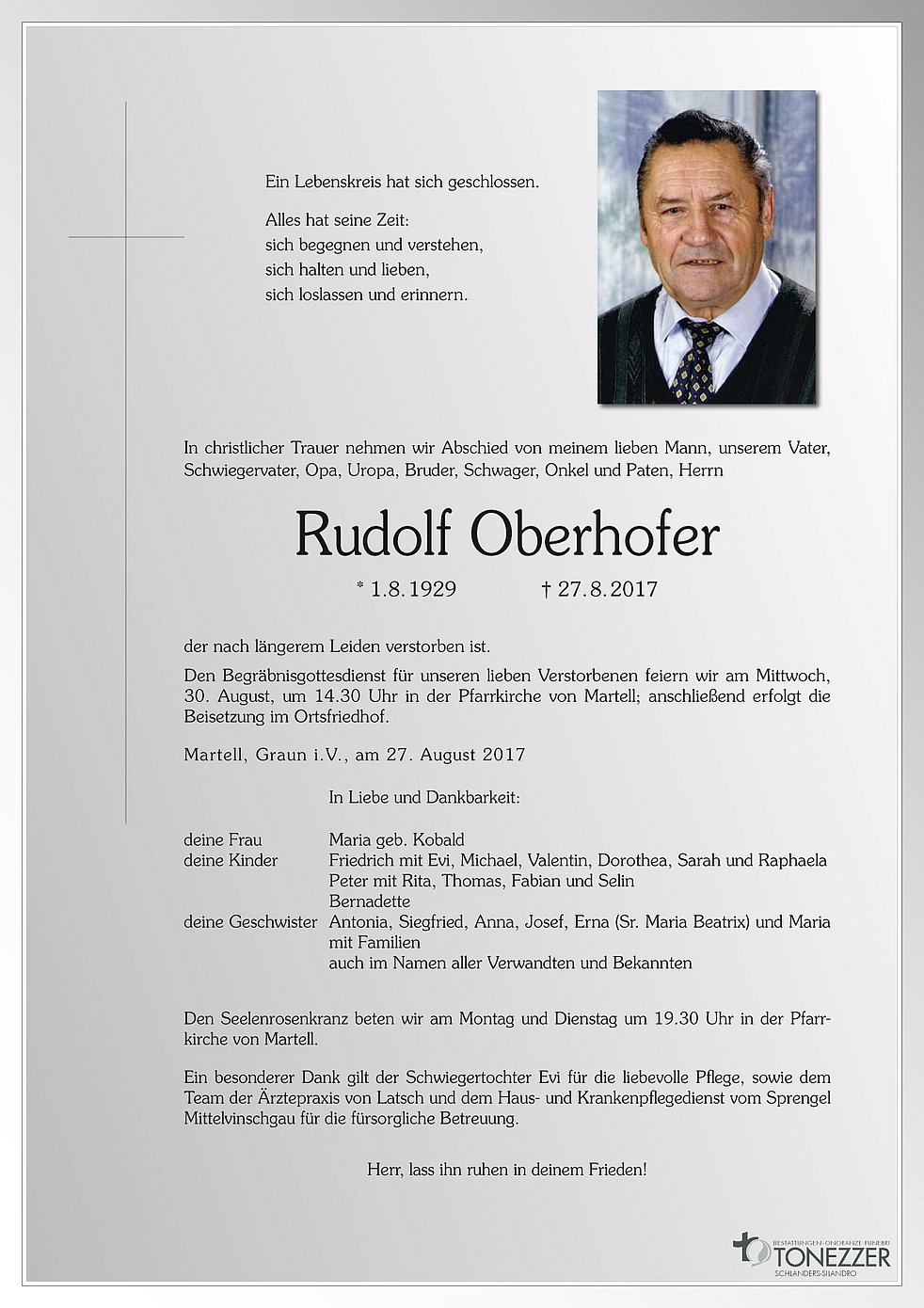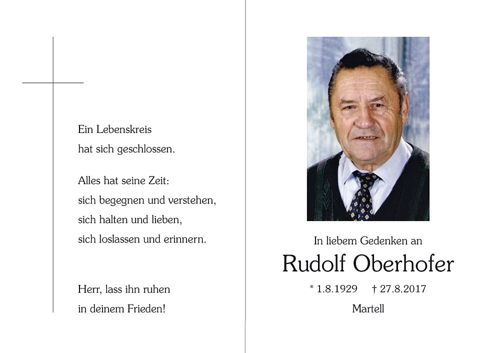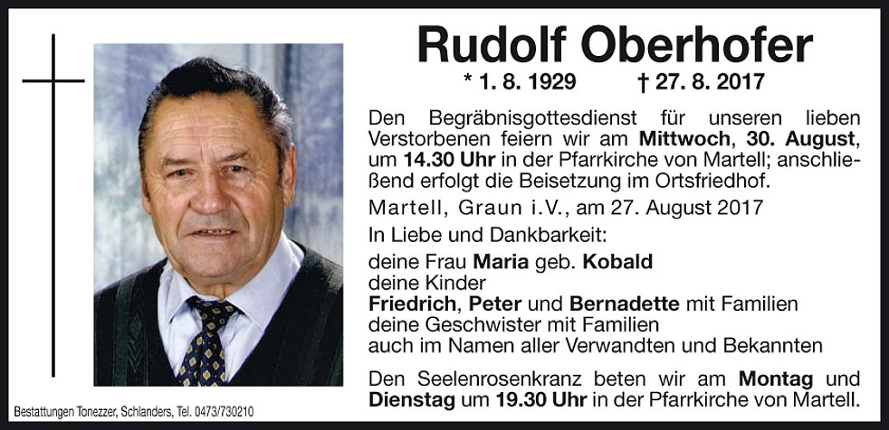 Den Begräbnisgottesdienst für unseren lieben Verstorbenen feiern wir am Mittwoch, 30. August, um 14.30 Uhr in der Pfarrkirche von Martell; anschließend erfolgt die Beisetzung im Ortsfriedhof.