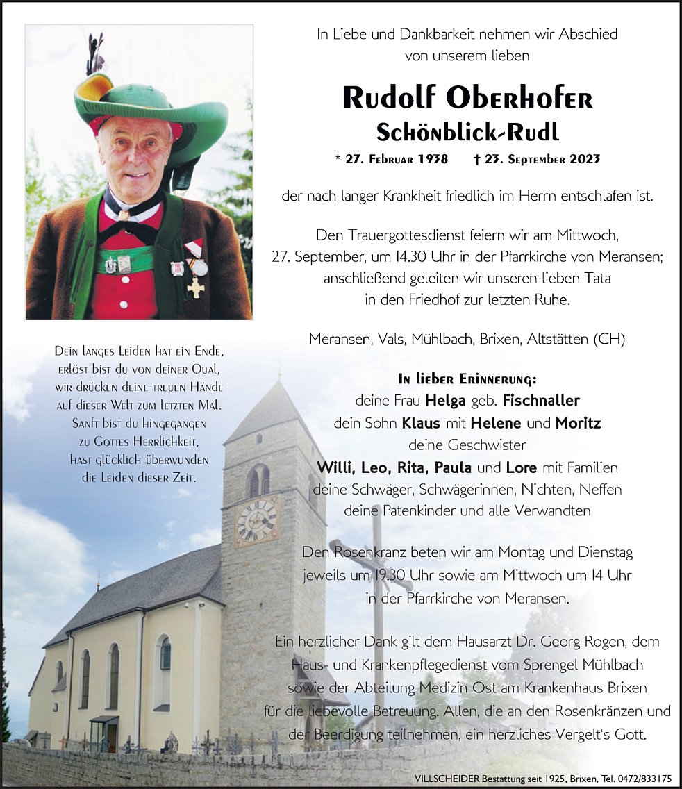 Was man tief in seinem Herzen besitzt, dass kann man durch den Tod nicht verlieren. ...und doch idt einer, der dieses Fallen unendlich sanft in seinen Haenden haellt. Lieber Rudl, i hon mit dir viele scheana und lustige Momente kop. I hon di gean ollm getroffn und du hosch ollm an Witz gewisst. I wuensch dir jetz a guita Reise und hilf mir bitte, wenn i in Not bin. Do gesomtn Schoenblick Familie und olla Hinterbliebenen druckn mir ihnso Beileid aus und wuenschen ihnen gonz viel Kroft.
