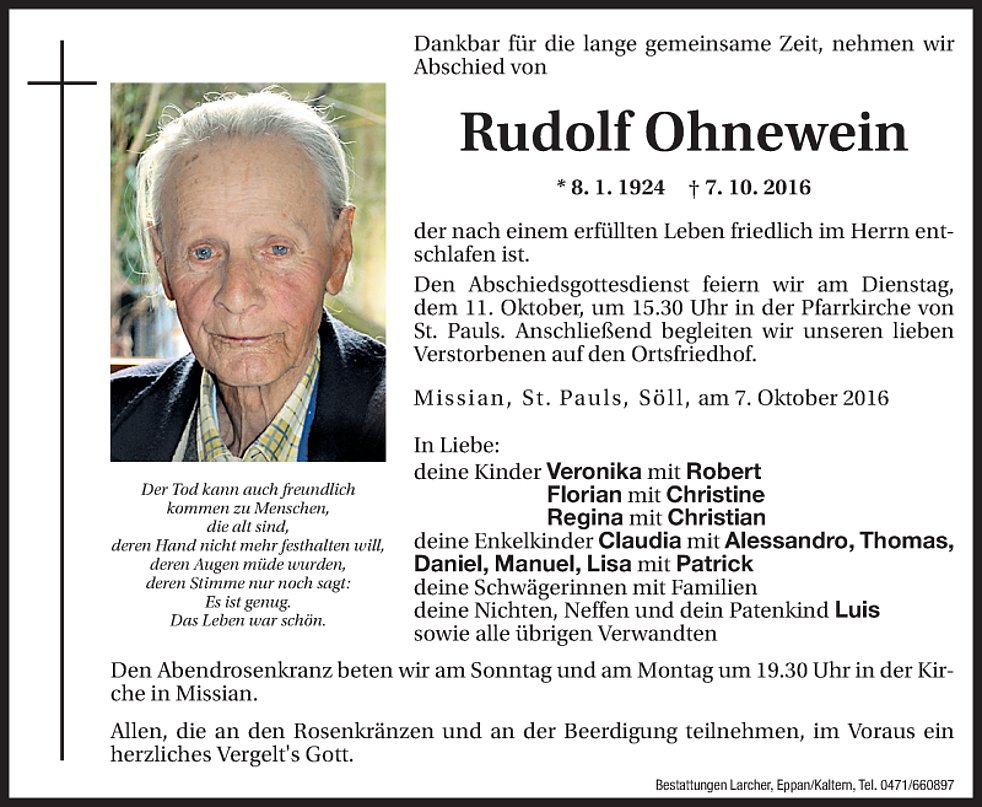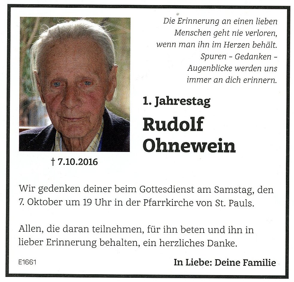 Den Abschiedsgottesdienst feiern wir am Dienstag, dem 11. Oktober um 15.30 Uhr in der Pfarrkirche von St. Pauls. Anschließend begleiten wir unseren lieben Verstorbenen auf den Ortsfriedhof.