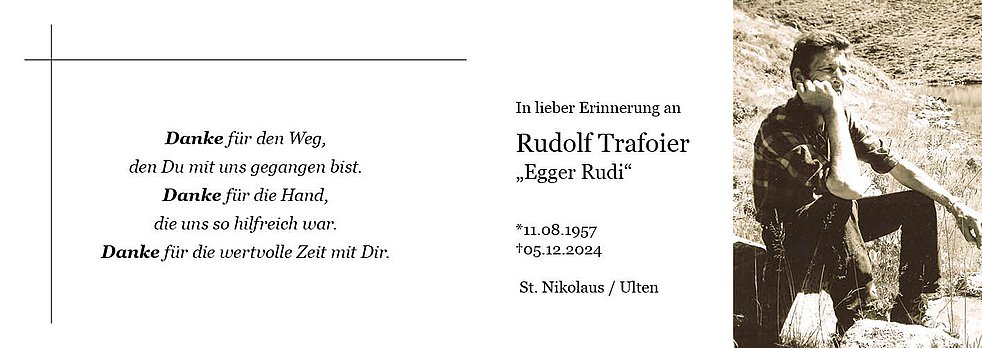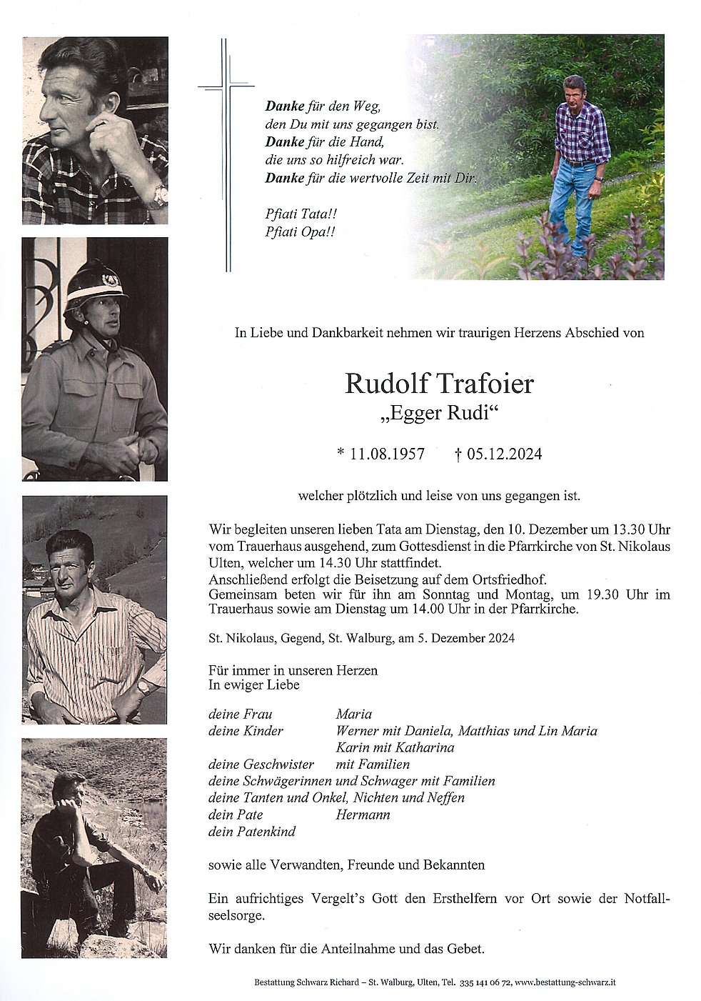 Wir begleiten unseren lieben Tata am Dienstag, den 10. Dezember um 13.30 Uhr vom Trauerhaus ausgehend, zum Gottesdienst in die Pfarrkirche von St. Nikolaus Ulten, welcher um 14.30 Uhr stattfindet.