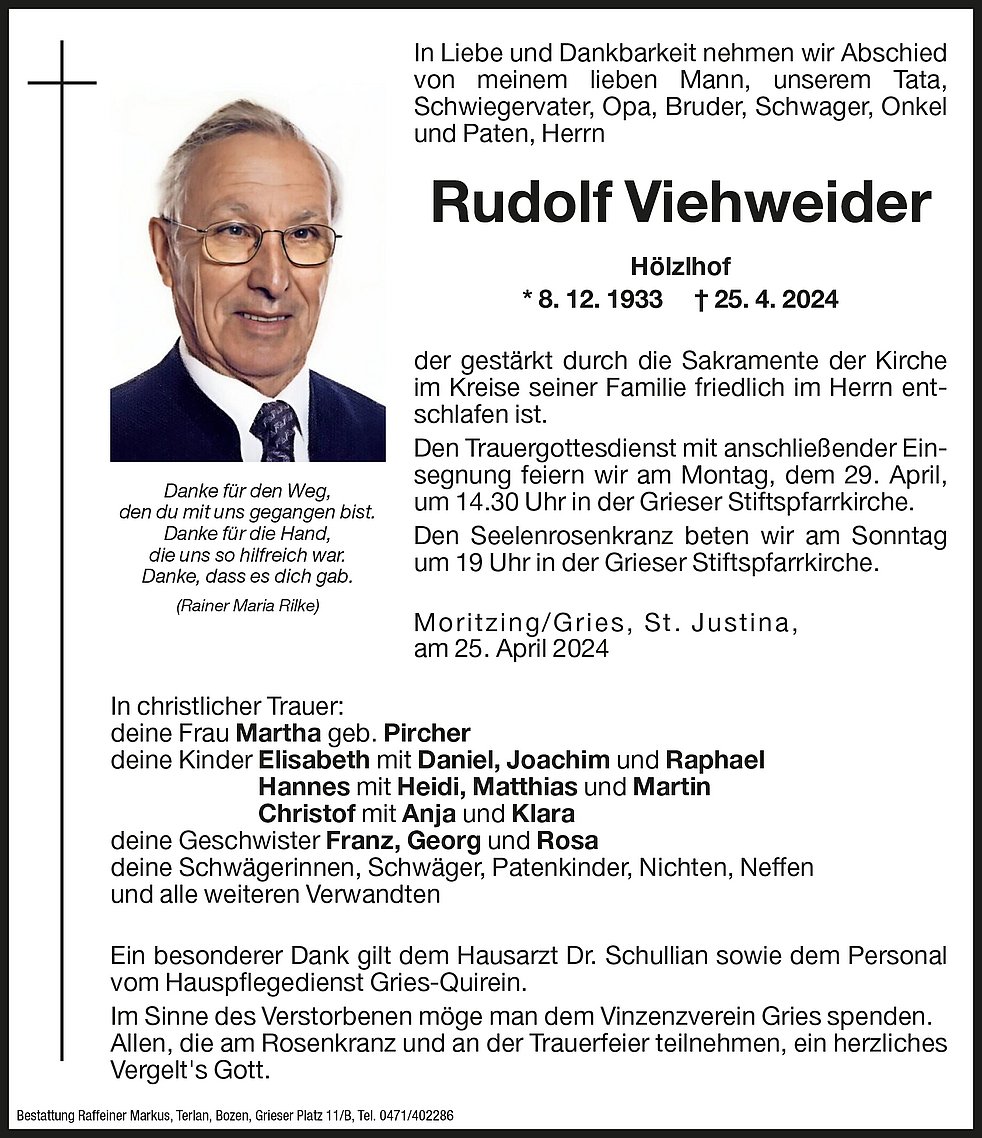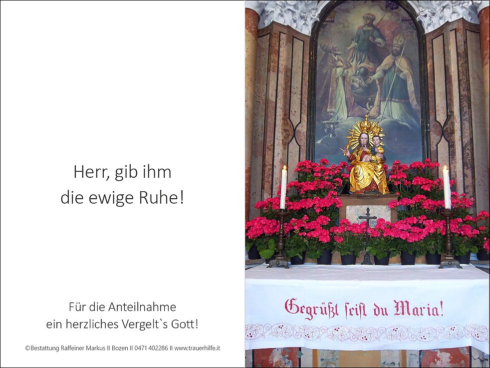 Den Trauergottesdienst mit anschließender Einsegnung feiern wir am Montag, dem 29. April, um 14.30 Uhr in der Grieser Stiftspfarrkirche.