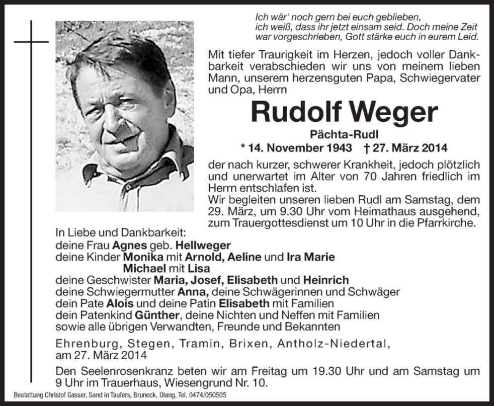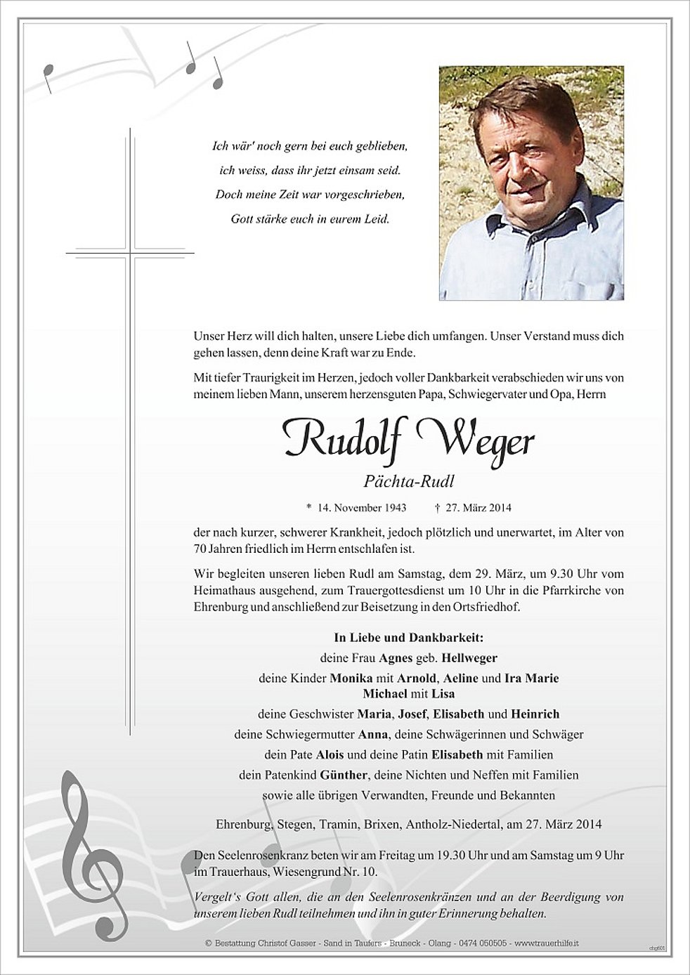 Wir begleiten unseren lieben Rudl am Samstag, dem 29. März, um 9.30 Uhr vom Heimathaus ausgehend, zum Trauergottesdienst um 10 Uhr in die Pfarrkirche von Ehrenburg und anschließend zur Beisetzung in den Ortsfriedhof.