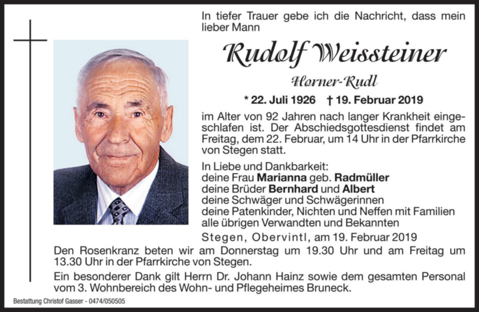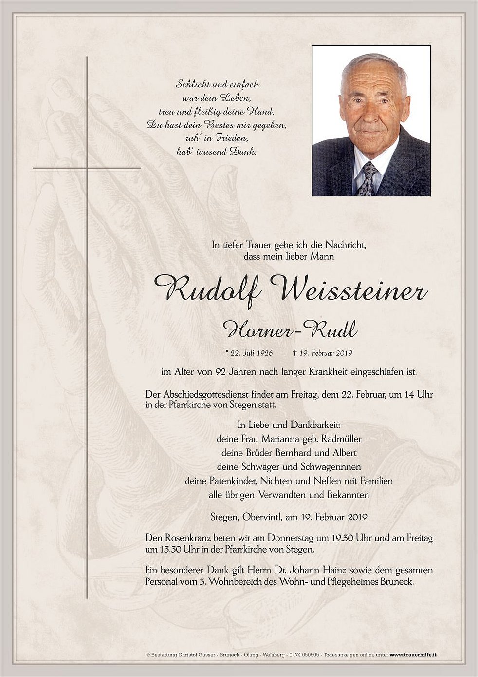 Der Abschiedsgottesdienst findet am Freitag, dem 22. Februar, um 14 Uhr in der Pfarrkirche von Stegen statt.