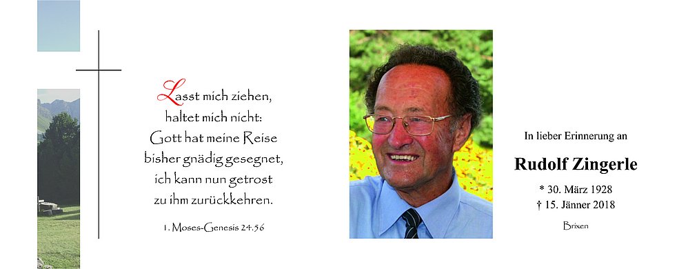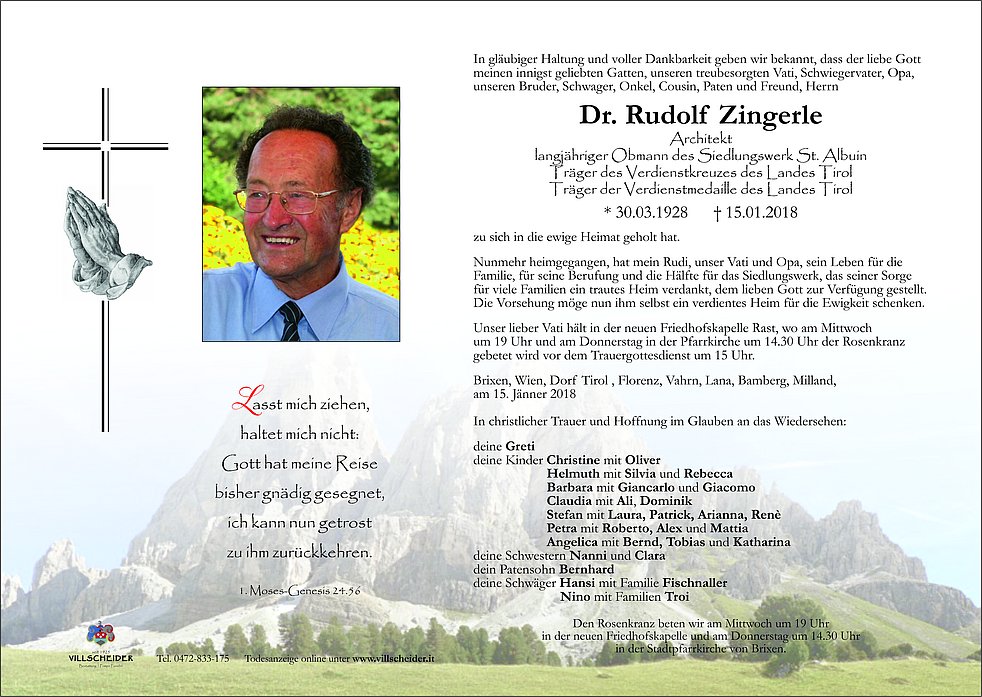 Nunmehr heimgegangen, hat mein Rudi, unser Vati und Opa, sein Leben für die Familie, für seine Berufung und die Hälfte für das Siedlungswerk, das seiner Sorge für viele Familien ein trautes Heim verdankt, dem lieben Gott zur Verfügung gestellt. Die Vorsehung möge nun ihm selbst ein verdientes Heim für die Ewigkeit schenken.