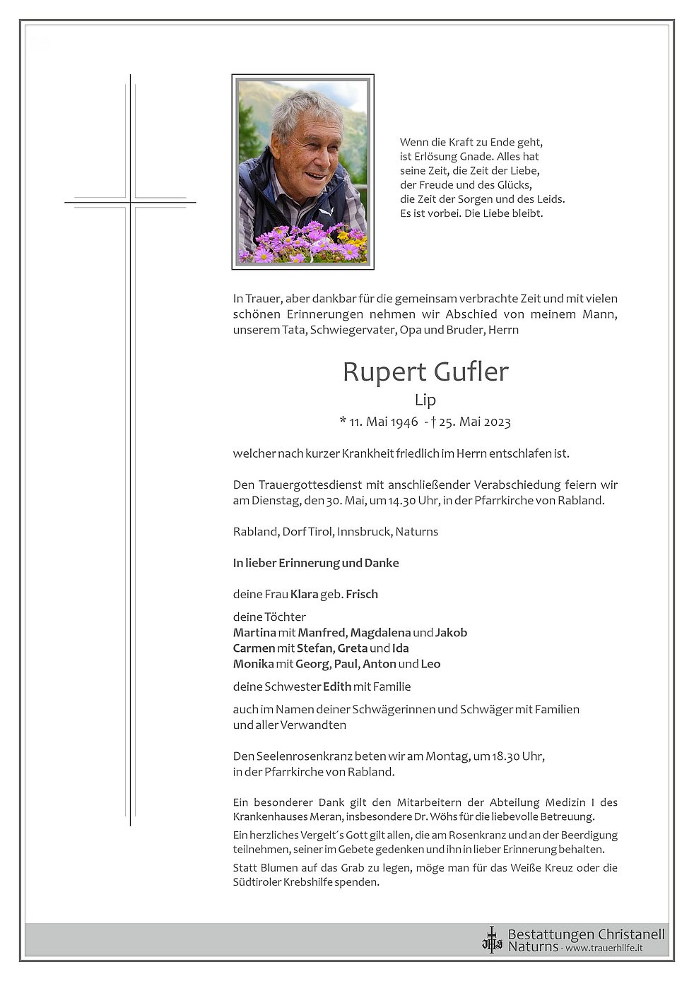 Den Trauergottesdienst mit anschließender Verabschiedung feiern wir am Dienstag, den 30. Mai, um 14.30 Uhr, in der Pfarrkirche von Rabland.