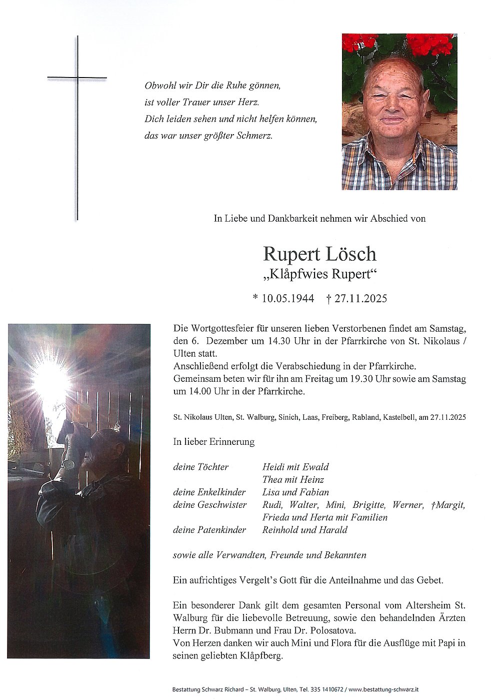 Die Wortgottesfeier für unseren lieben Verstorbenen findet am Samstag, den 6. Dezember um 14.30 Uhr in der Pfarrkirche von St. Nikolaus / Ulten statt.