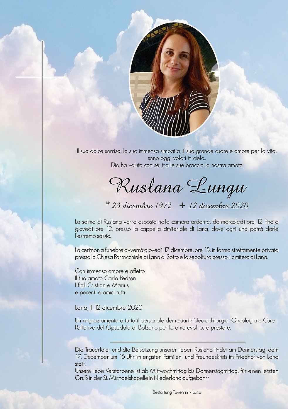 Ho conosciuto la Signora solo poche settimane fa e l‘ho incontrata una sola volta... sono rimasta impressionata da tanta dignita’ e fascino nonostante il peso del destino.. Le mie piu‘ sentite condoglianze al Sig. Carlo e alla famiglia. Elke Schlemmer