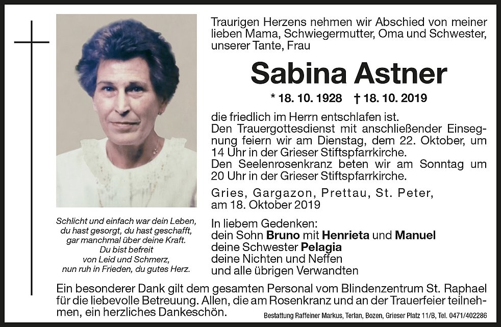 Den Trauergottesdienst mit anschlieβender Einsegnung feiern wir am Dienstag, dem 22. Oktober, um 14 Uhr in der Grieser Stiftspfarrkirche.