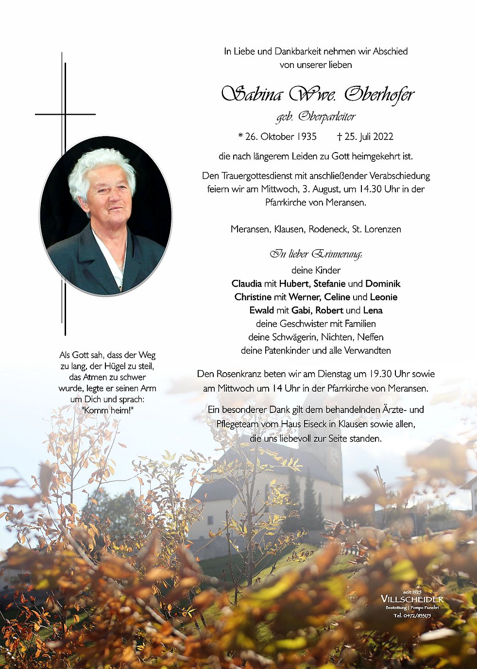 Trauerfeier: 03.08. - 14:30 Uhr Meransen