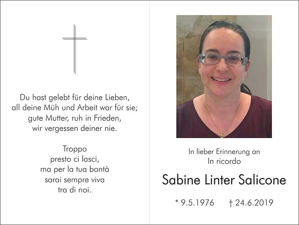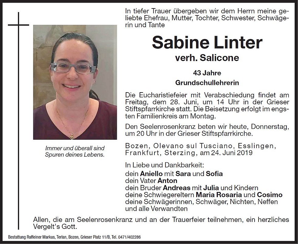 In tiefer Trauer übergeben wir dem Herrn meine geliebte Ehefrau, Mutter, Tochter, Schwester, Schwägerin und Tante